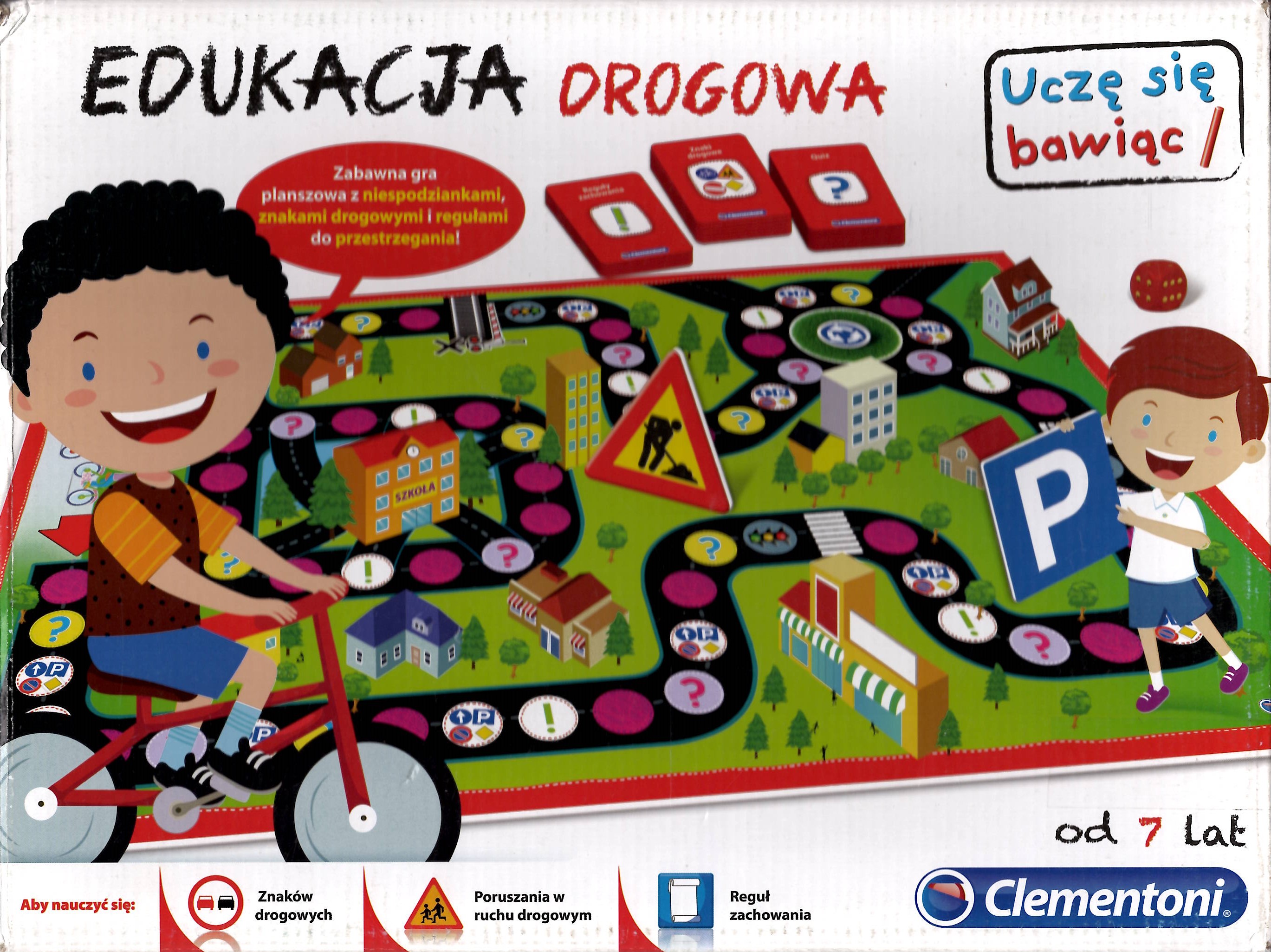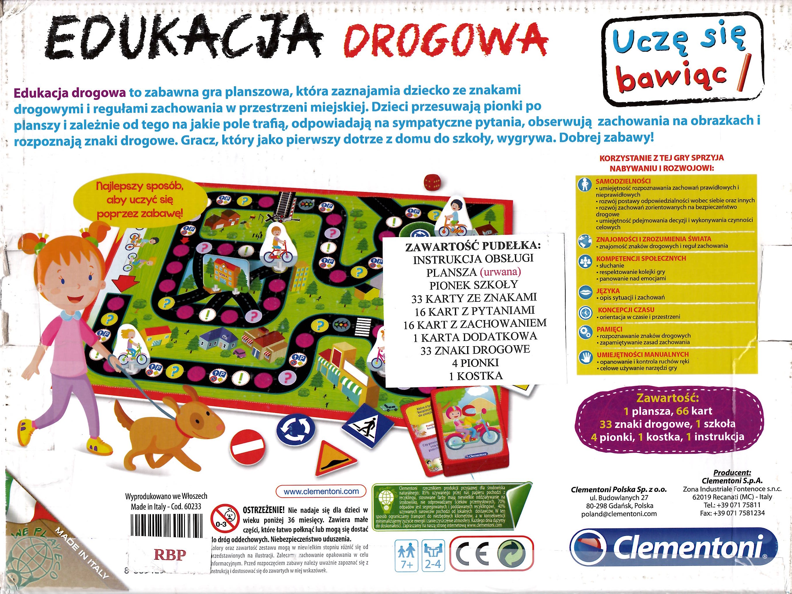 Edukacja drogowa : zabawna gra planszowa z niespodziankami znakami drogowymi i regułami do przestrzegania! - Gdańsk : Clementoni Polska, [2018]. - 1 gra (plansza do gry, 1 szkoła, 33 znaki drogowe, 16 kart z pytaniami do quizu, 16 kart z regułami zachowania, 1 karta dodatkowa, 33 karty ze znakami, 4 pionki, 1 kostka) karton, plastik, tektura, kolor ; w pudełku 37x28x5 cm + instrukcja (4 strony : ilustracje ; 22 cm).