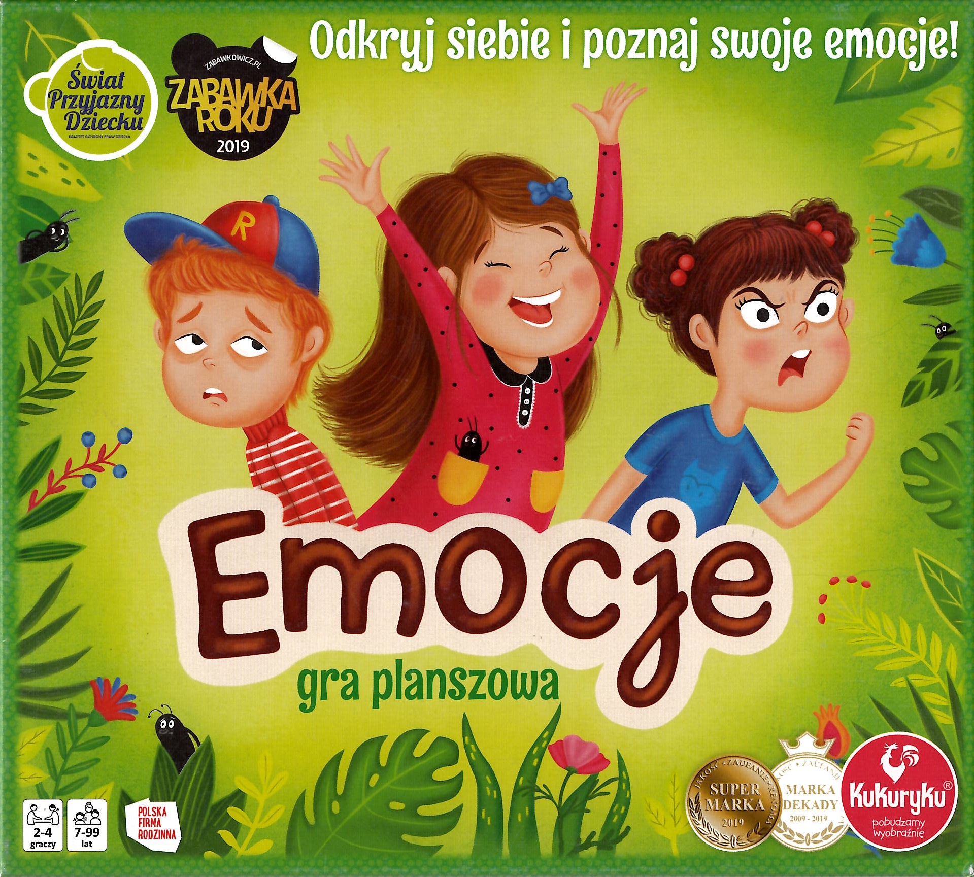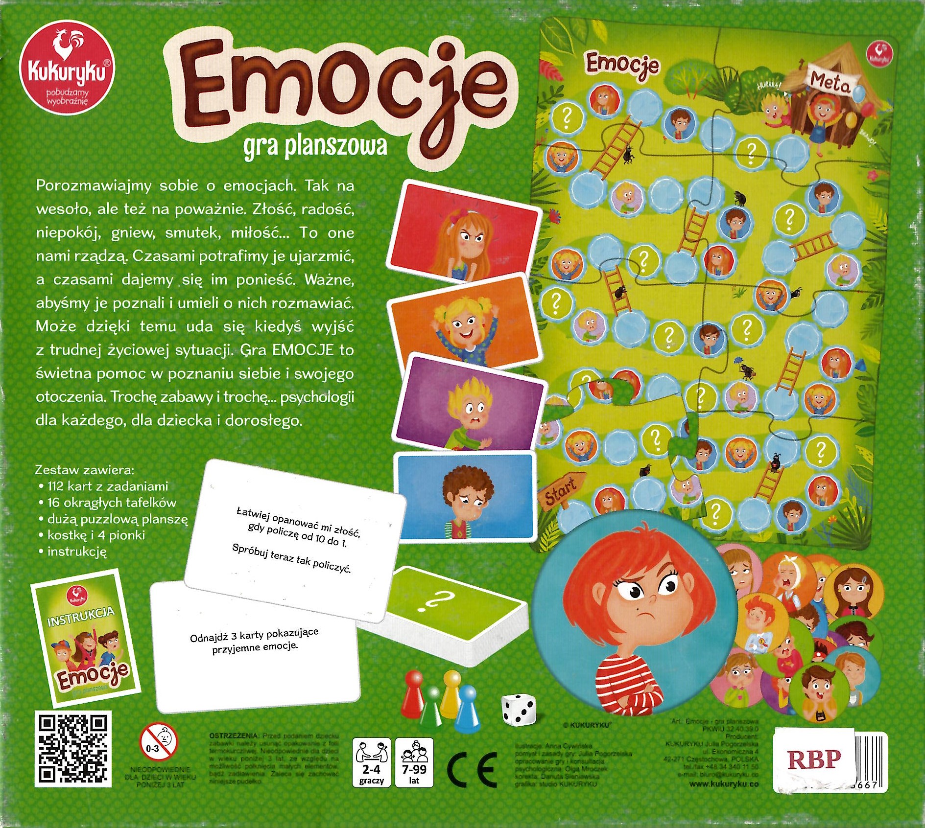 Emocje : gra planszowa / opracowanie gry i konsultacja psychologiczna Olga Mroczek ; ilustracje Anna Cywińska ; pomysł i zasady gry Julia Pogorzelska. - Częstochowa : Kukuryku, [2019]. - 1 gra (plansza z 8 puzzli, karty z zadaniami, okrągłe karty z emocjami, 4 pionki, kostka do gry) : karton, tektura, plastik, kolor ; w pudełku 22x25x5 cm + instrukcja (4 strony : ilustracje ; 21 cm).
