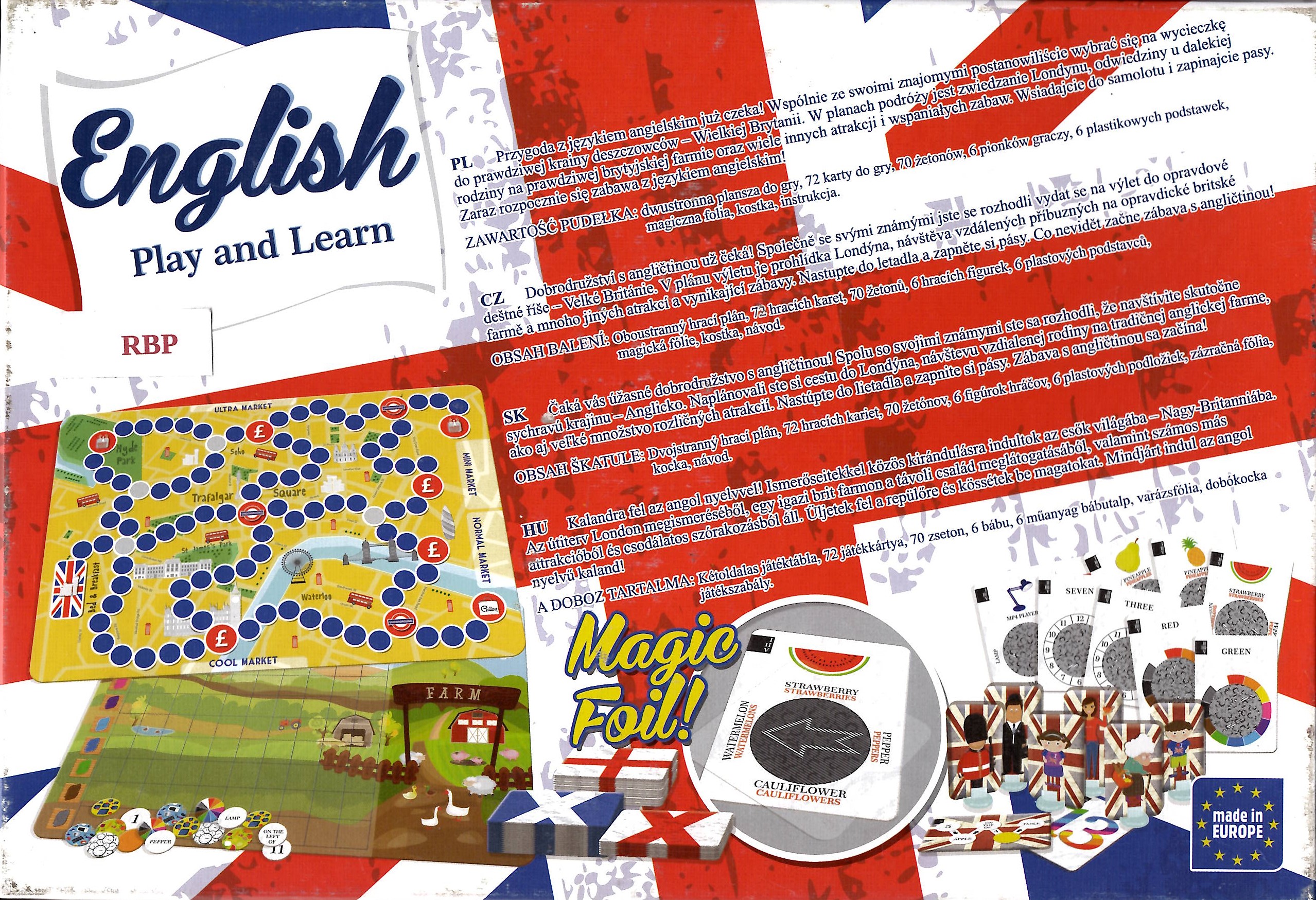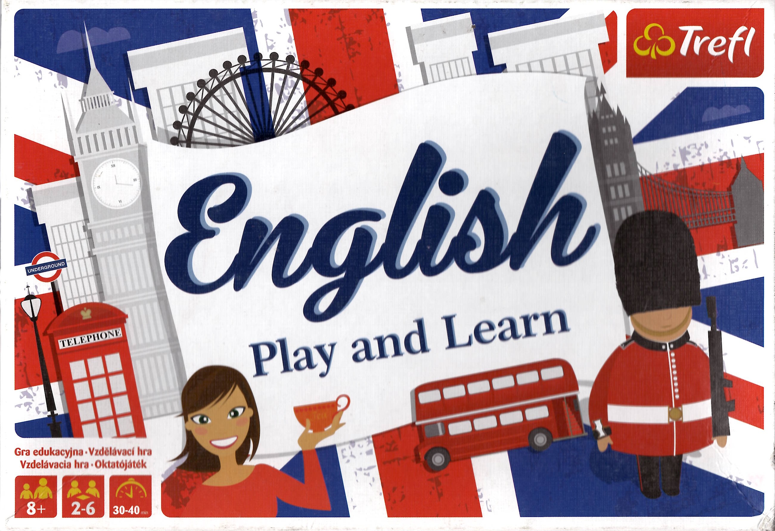 English : play and learn / Krystian Skrzyszewski ; opracowanie graficzne Natalia Łuczyńska. - Gdynia : Trefl, [2016]. - 1 gra (dwustronna plansza do gry, 72 karty do gry, 70 żetonów, 6 pionków graczy, 6 plastikowych podstawek, magiczna folia, kostka) : karton, tektura, plastik, kolor ; w pudełku 23x32x6 cm + instrukcja (31 stron : ilustracje ; 21 cm).