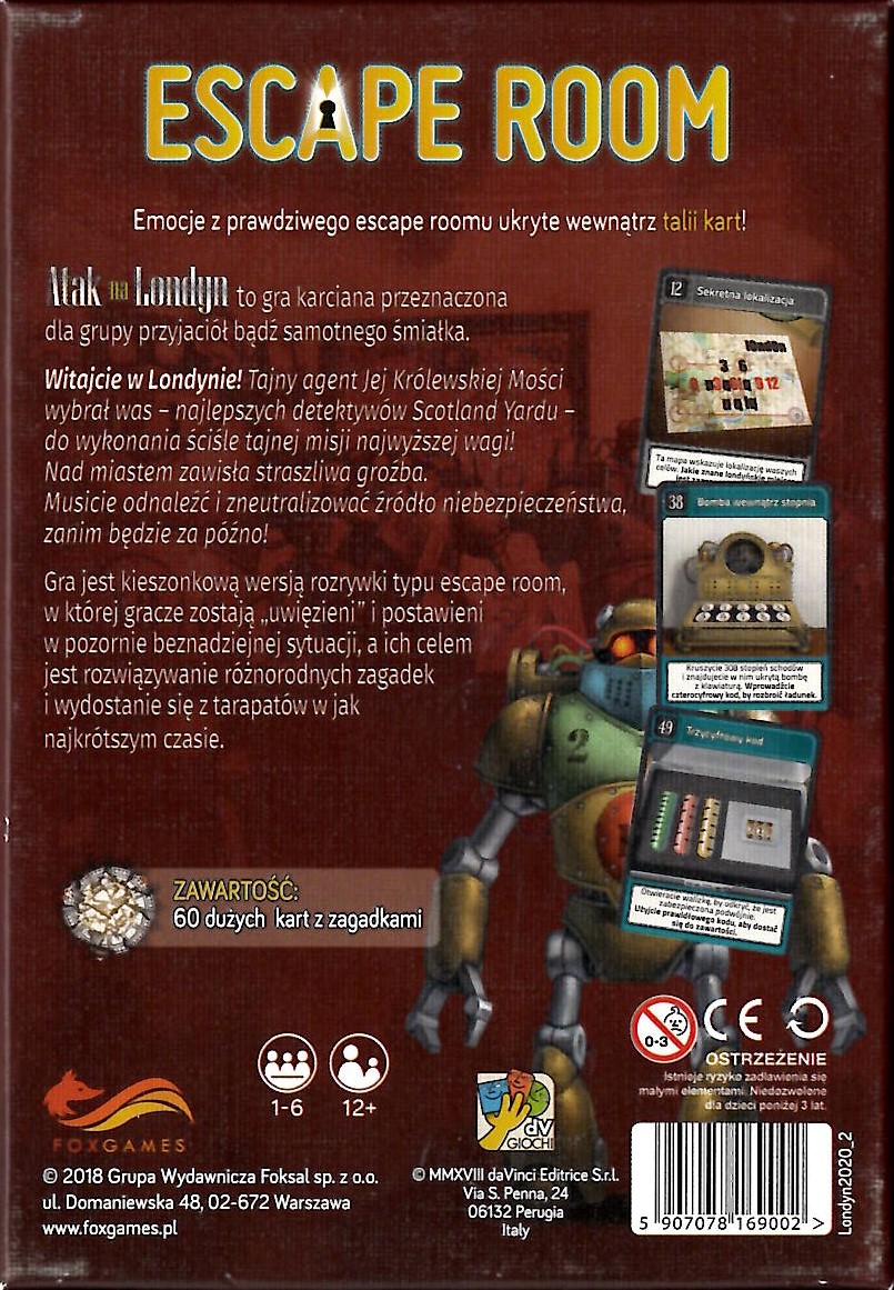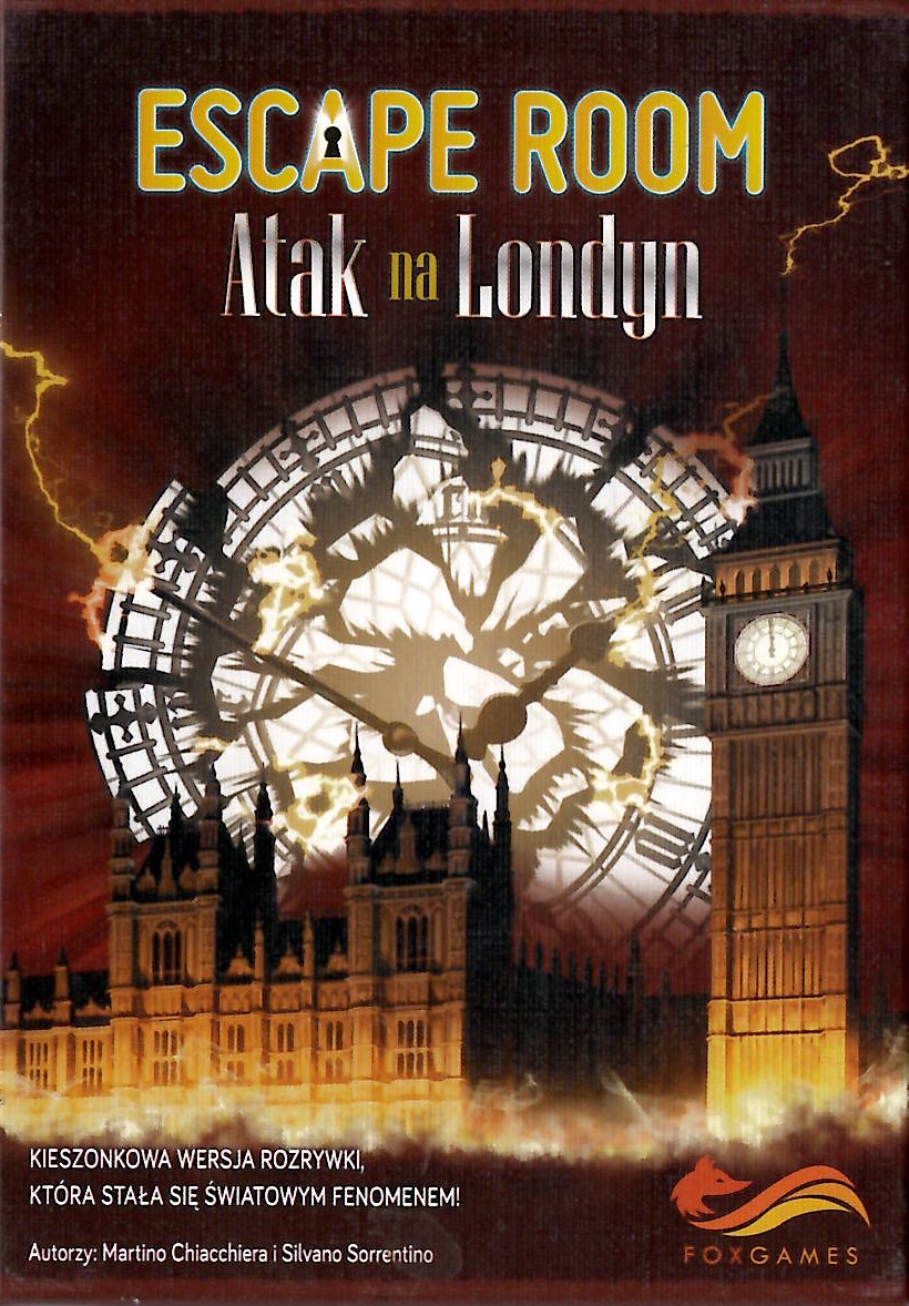 Escape Room : atak na Londyn / Martino Chiacchiera, Silviano Sorrentino. - Warszawa : Foxgames - Grupa Wydawnicza Foksal, 2018. - 1 gra (60 dużych kart z zagadkami) : karton, kolor ; w pudełku 16x11x4 cm.