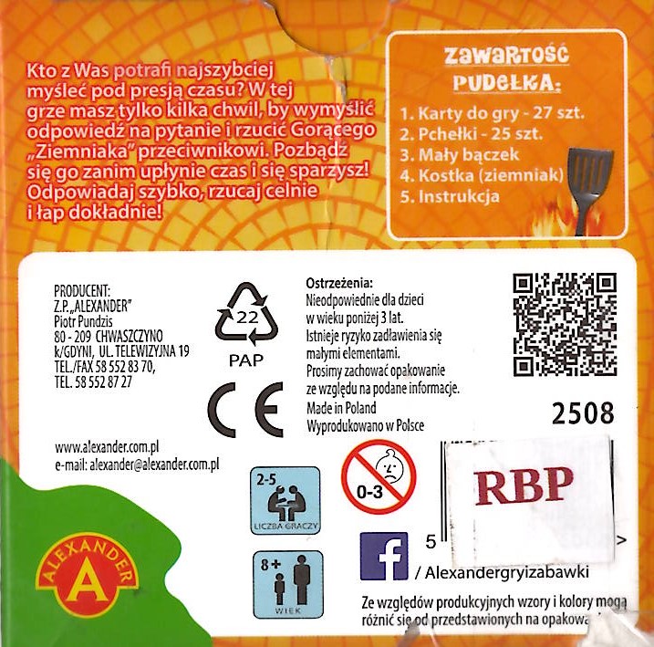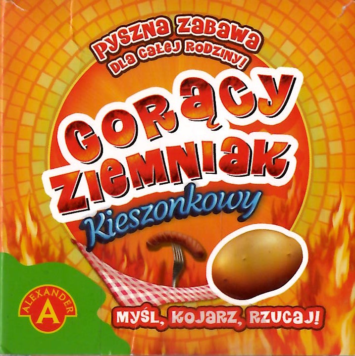 Gorący ziemniak kieszonkowy : pyszna zabawa dla małych i dużych : myśl, kojarz, rzucaj! - Chwaszczyno : Aleksander, [2018]. - 1 gra (27 kart do gry, 25 pchełek, mały bączek, kostka) : karton, plastik, kolor ; w pudełku 10x10x2 cm + instrukcja (10 stron : ilustracje ; 9 cm).