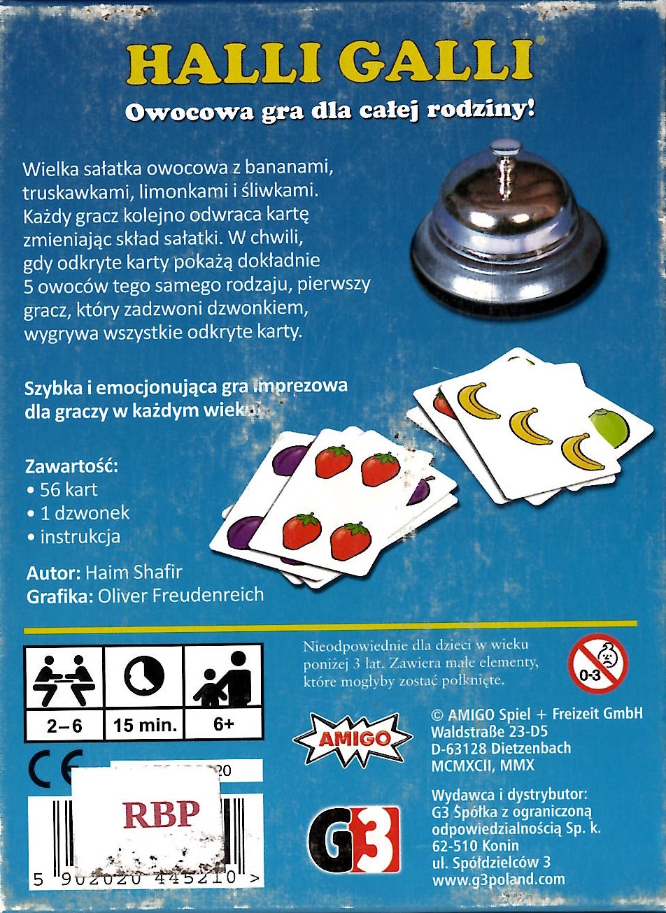 Halli Galli : owocowa gra dla całej rodziny / Haim Shafir ; grafika: Oliver Freudenreich. - Konin : G3 Spółka z ograniczoną odpowiedzialnością Sp.k., 2012. - 1 gra (56 kart, 1 dzwonek) : metal, karton, kolor ; w pudełku 17x13x6 cm + instrukcja [1] strona.