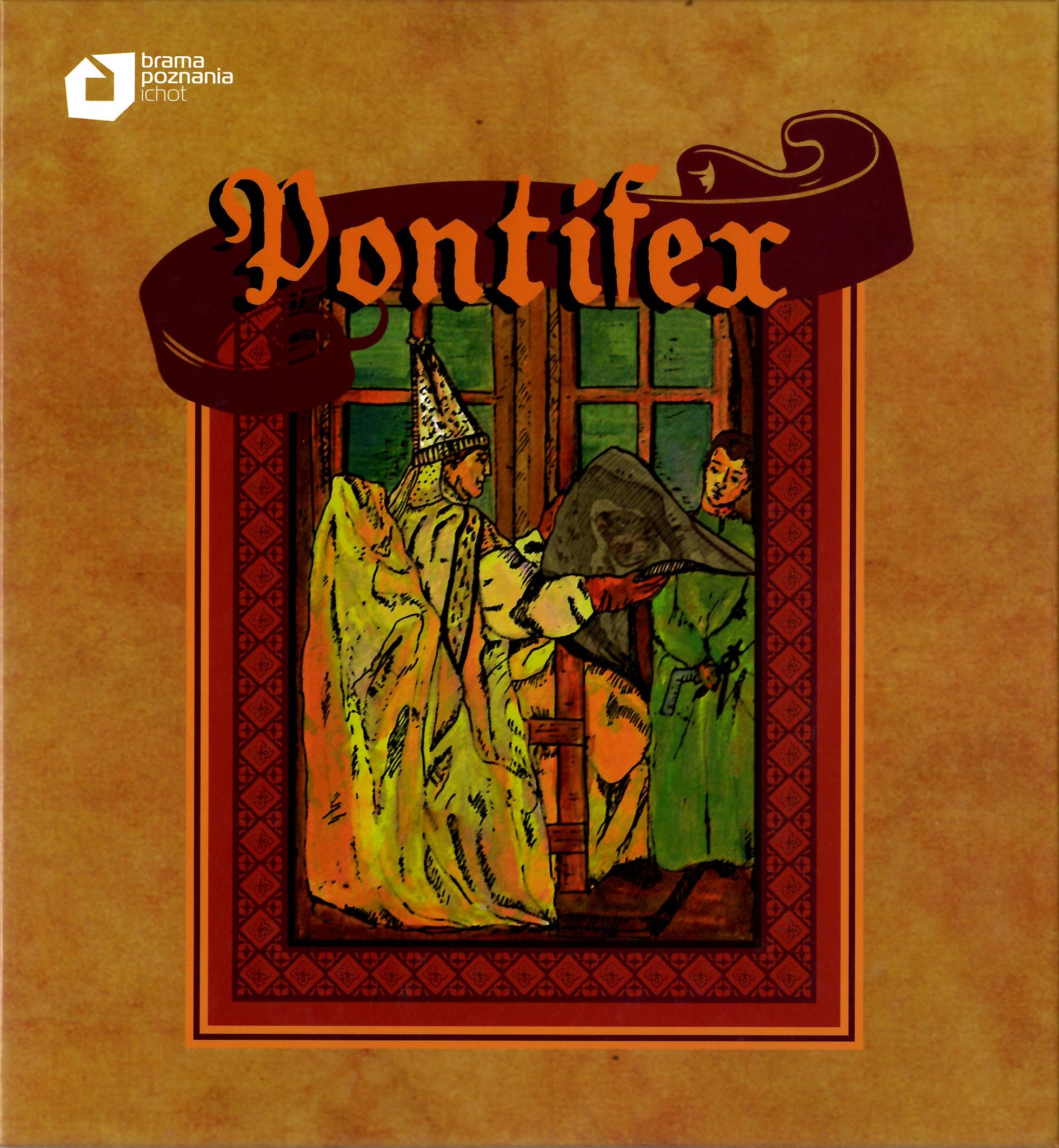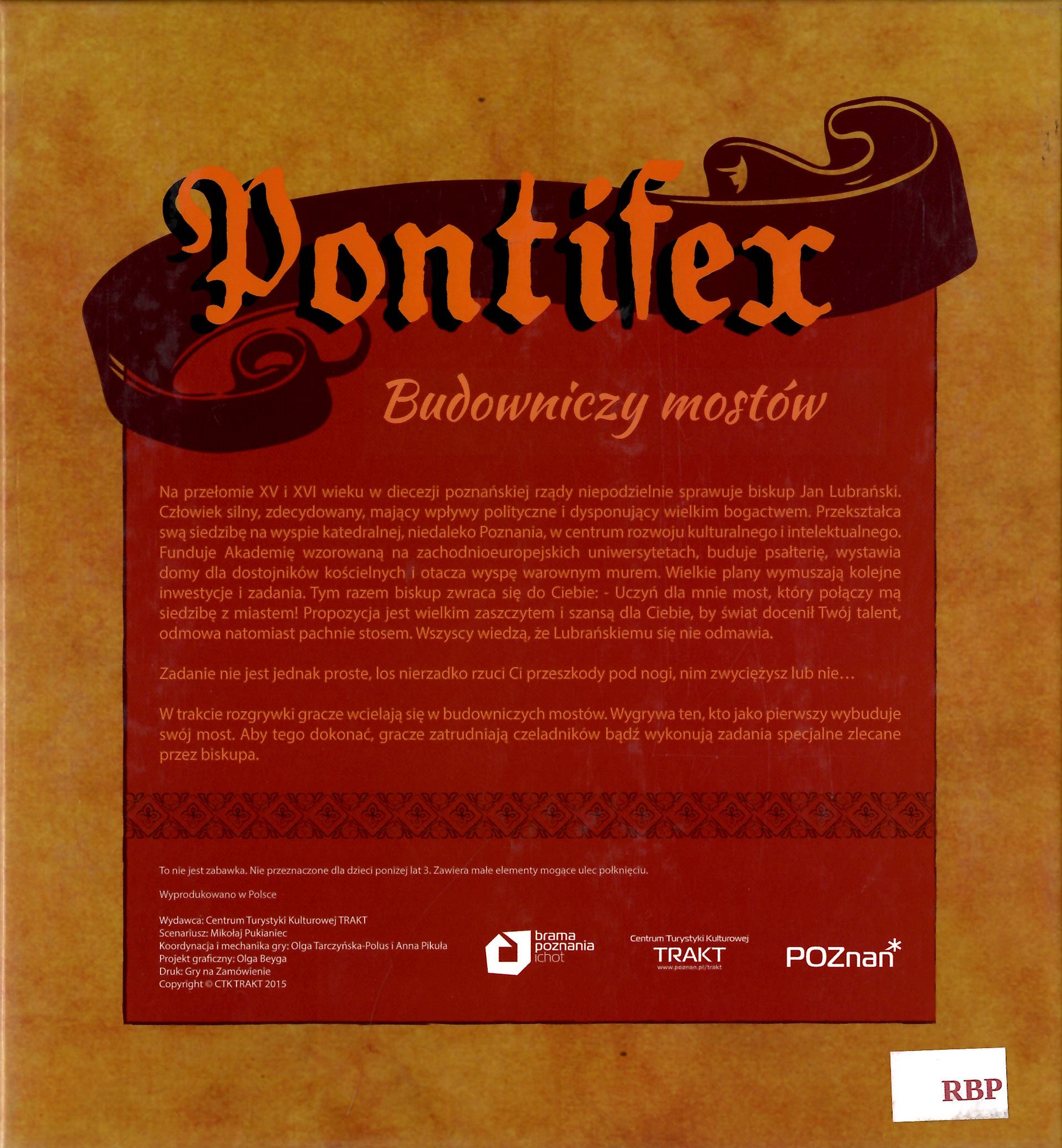 Pontifex : budowniczy mostów / scenariusz Mikołaj Pukianiec ; projekt graficzny Olga Beyga. - Poznań : Centrum Turystyki Kulturowej Trakt, 2015. - 1 gra (24 kafelki z mostami, 55 kart "Czeladników", 1 kostka, 4 pionki, plansza) : karton, kolor, plastik ; w pudełku 7x25 x27 cm + instrukcja (2 strony : ilustracje ; 24 cm).