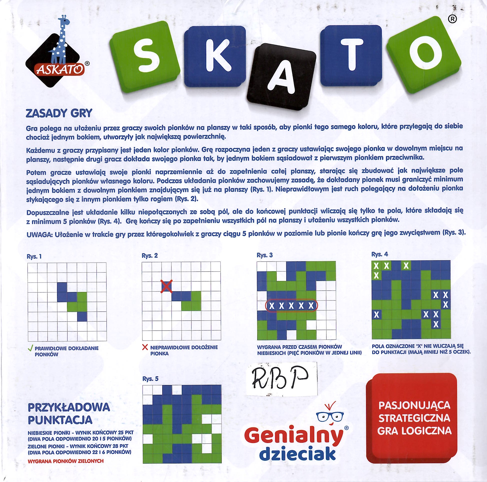 Skato / Andrzej Undro. - Poznań : Askato, [2023]. - 1 gra (1 plansza, 63 kostki, woreczek) : karton, kolor, plastik ; w pudełku 25x25x7 cm.