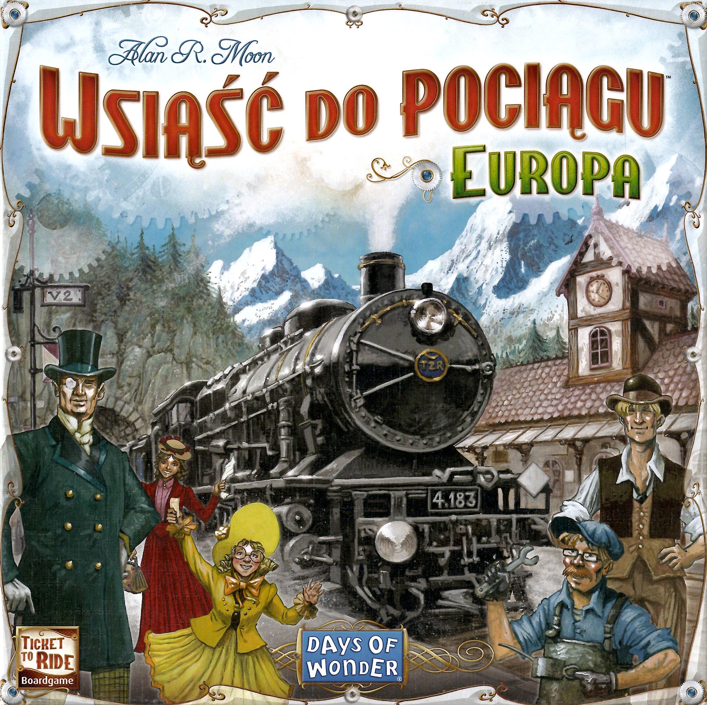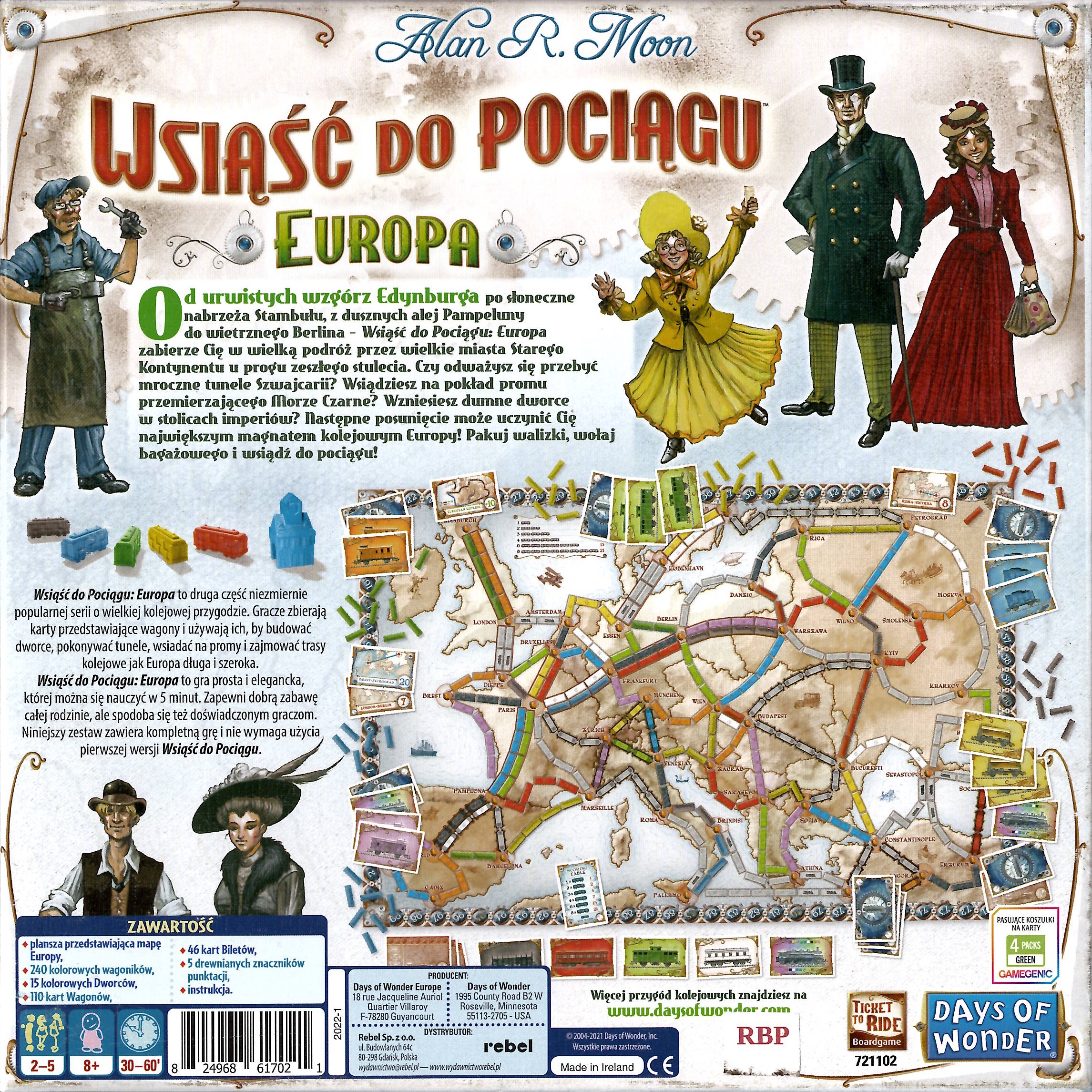 Wsiąść do pociągu : Europa / Alan R. Moon ; ilustracje Julien Delval ; tłumaczenie Magdalena Jedlińska, Szymon Szweda, Tomasz Z. Majkowski. - Gdańsk : Rebel, 2015. - 1 gra (plansza przedstawiająca mapę Europy, 240 kolorowych figurek wagonów, 15 kolorowych figurek dworców, 110 kart wagonów, 46 kart biletów, 5 drewnianych znaczników punktacji) : karton, plastik, drewno ; w pudełku 30x29x7 cm + instrukcja (8 stron : ilustracje ; 29 cm).
