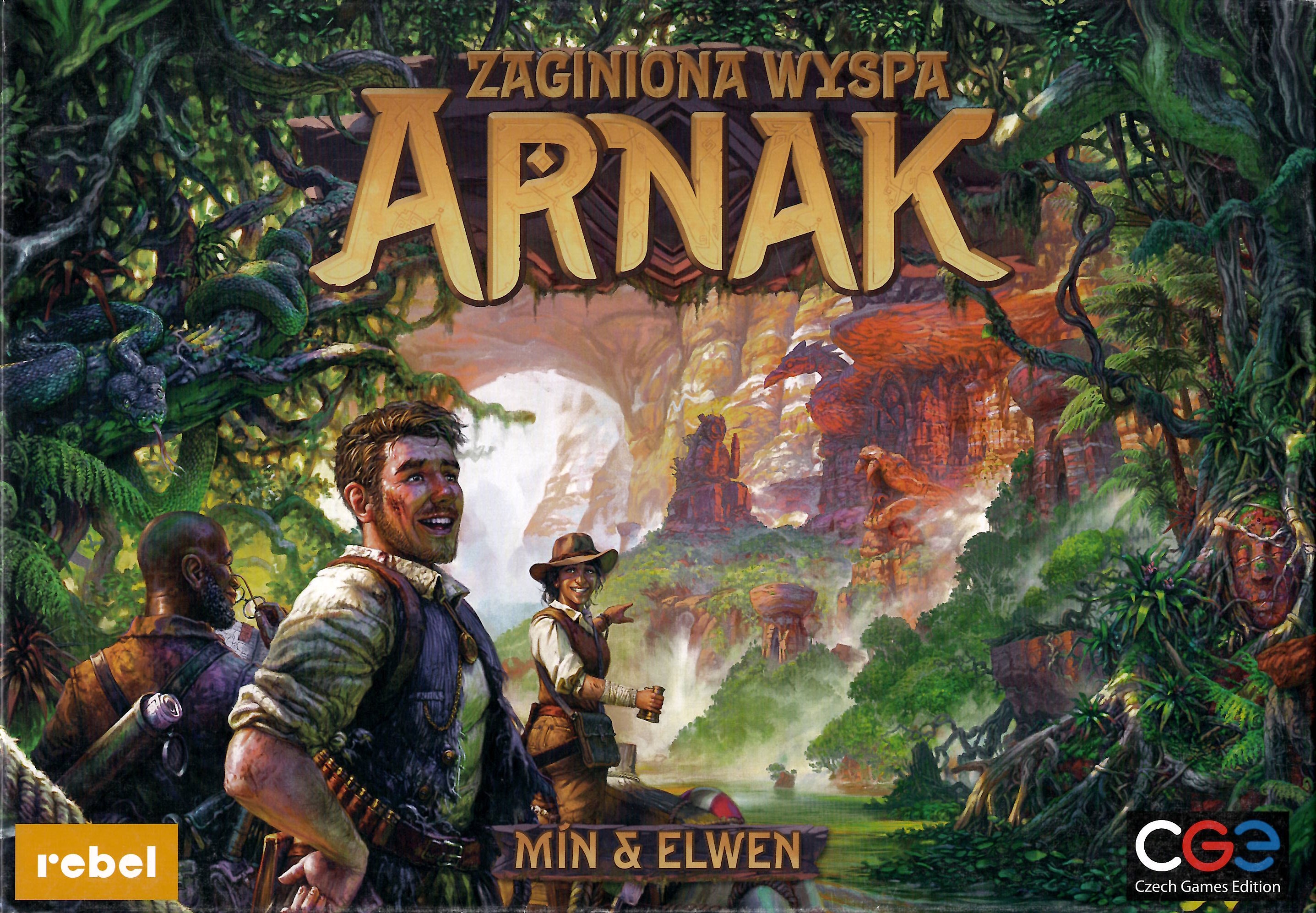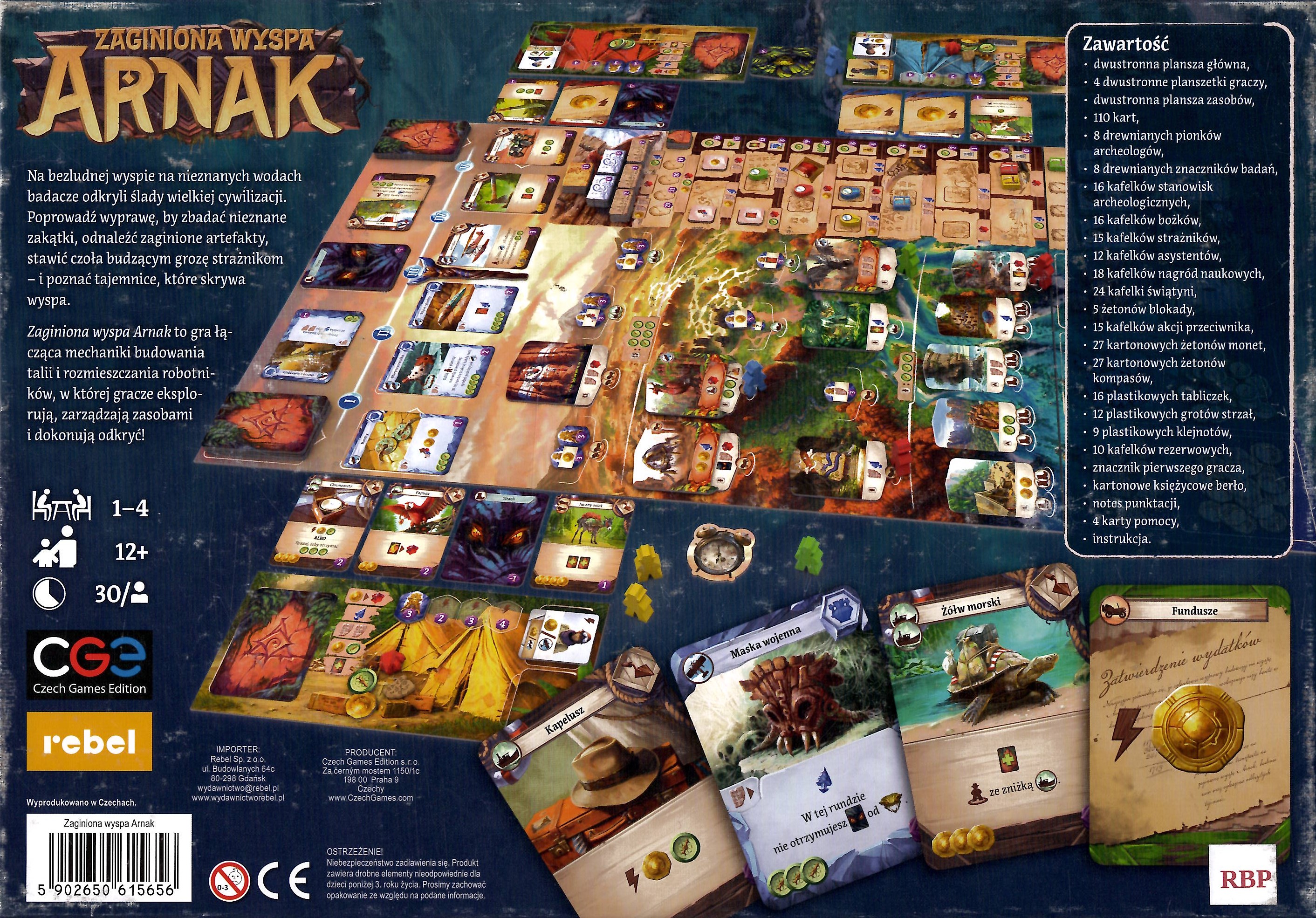 Zaginiona wyspa Arnak / Min & Elwen ; projekt graficzny Filip Murmak ; tłumaczenie Agnieszka Chrzanowska. - Gdańsk : Rebel, 2020. - 1 gra (dwustronna plansza główna, 4 dwustronne planszetki graczy, dwustronna plansza zasobów, 110 kart, 8 drewnianych pionków archeologów, 8 drewnianych znaczników badań, 16 kafelków stanowisk archeologicznych, 16 kafelków bożków, 15 kafelków strażników, 12 kafelków asystentów, 18 kafelków nagród naukowych, 24 kafelki świątyni, 5 żetonów blokady, 15 kafelków akcji przeciwnika, 27 kartonowych żetonów monet, 27 kartonowych żetonów kompasów, 16 plastikowych tabliczek, 12 plastikowych grotów strzał, 9 plastikowych klejnotów, 10 kafelków rezerwowych, znacznik pierwszego gracza, kartonowe księżycowe berło, notes punktacji, 4 karty pomocy) : drewno, tektura, kolor ; w pudełku 7x27x37 cm + instrukcja (24 strony : ilustracje ; 32 cm).
