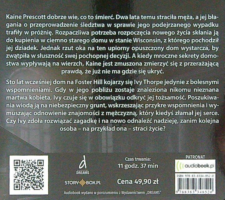 Tylko, czy Kaine uda się kiedyś uciec przed tym koszmarem? Czy dowie się kto jest jej prześladowcą i dlaczego to robi? Kto jest tak na prawdę winny śmierci jej męża? Co kryje w sobie dom, którego stała się właścicielką? Czy uda jej się ułożyć życie na nowo?