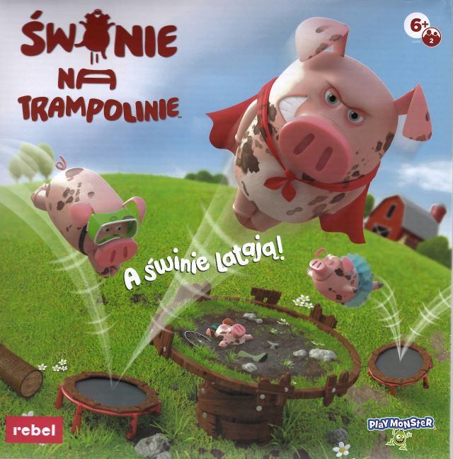 Świnie na trampolinie. - Gdańsk : Rebel, 2024. - 1 gra (4 gumowe świnki, 2 trampoliny, 7 błotnych placków, bajoro) : karton, tektura, plastik, guma, kolor ; w pudełku 28x27x8 + instrukcja ([2] strony : ilustracje ; 28 cm).