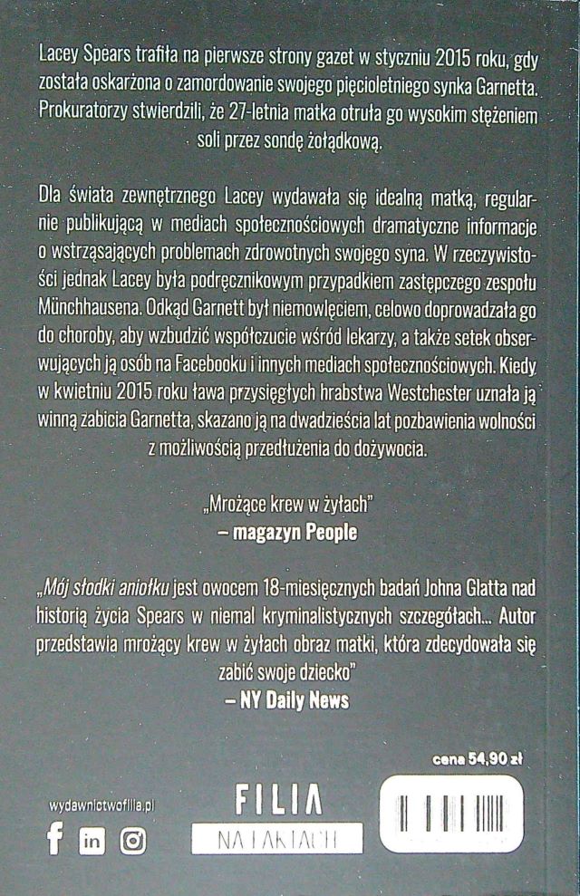 Malutki Garnett – karmiony przez sondę żołądkową od najmłodszych miesięcy życia, w wieku 5 lat właśnie przez nią został otruty. Matka podała mu przez nią tak potężną dawkę stężenia soli, że maluch umarł w okropnych męczarniach. Całe życia małego Garetta było gehenną, gdyż matka specjalnie doprowadzała go do choroby, aby wzbudzić współczucie wśród lekarzy, przyjaciół oraz obcych, którzy obserwowali ją na portalach społecznościowych. Kilka osób zaobserwowało dziwne zachowanie matki- uśmiech, gdy chłopiec cierpiał, pogorszenie jej samopoczucia, gdy syn zdrowiał, nagła poprawa zdrowia chłopca podczas wizyt w szpitalu i pogarszanie się zdrówka gdy zostaje sam z matką. Jednak nikt nie zareagował na czas, Garnett cierpiał, lecz mimo cierpienia i bólu jakie zadawała mu jego rodzona matka, chłopiec był pogody, ciekawski świata i tętnił egerią, mimo ciągłych pobytów w szpitalu. Niestety radość życia dziecka, nie była radością jego matki… Wstrząsająca historia, która uczy (przynajmniej mnie),aby nie ulegać pozorom, aby słuchać dzieci i niezmiennie poszerzać wiedzę na temat ludzkiej psychiki.