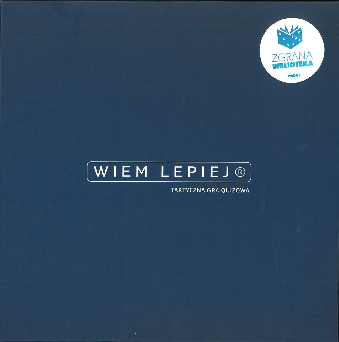Wiem lepiej : taktyczna gra quizowa / Jesper Bulow ; ilustracje Katarzyna Kaszorek. - Gdańsk : Rebel, 2021. - 1 gra (1 plansza główna, 4 planszetki drużyn, 20 płytek kategorii, 8 płytek wiem lepiej, 4 płlytki zamiana, 4 pionki, pudełko na karty z pytaniami, 150 kart z pytaniami, woreczek : karton, tkanina, tektura, kolor ; w pudełku 6x26x26 cm + instrukcja ([2] strony : ilustracje ; 25 cm).