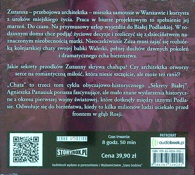 Chata / Agnieszka Panasiuk ; czyta Lena Schimscheiner. - Katowice : Wydawnictwo Szara Godzina s.c., ; Piaseczno : Heraclon International - Storybox.pl 2023. - 1 płyta CD (8 godz. 50 min.) : zapis cyfrowy, stereo ; 12 cm.