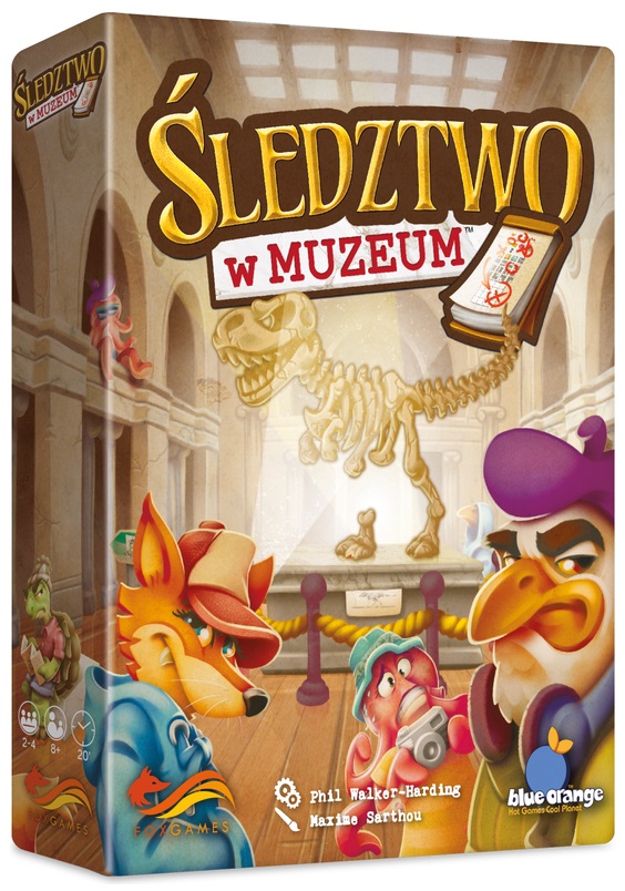 Śledztwo w Muzeum / Phil Walker-Harding ; ilustracje Maxime Sarthou ; tłumaczenie Kamila Wiatrzyk. - Warszawa : Grupa Wydawnicza Foksal, 2023. - 1 gra (24 kafelki podejrzanych, 1 kafele wyjścia ewakuacyjnego, 32 karty poszlak, 48 żetonów śledztwa, 4 żetony detektywów, 4 notesy śledcze, 4 ołówki) ; w pudełku 6x20x27 cm + instrukcja (4 stron : ilustracje ; 19 cm).