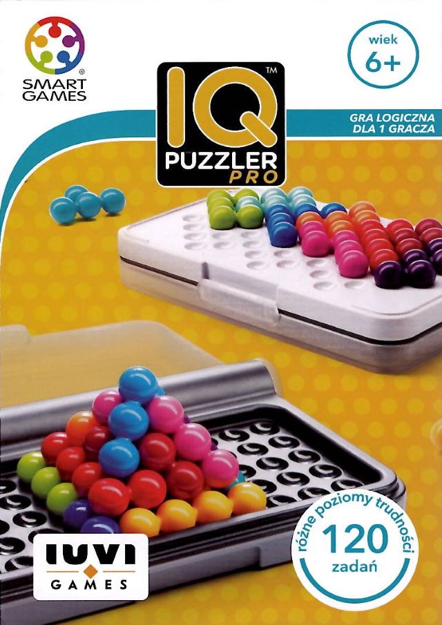 IQ puzzler pro : gra logiczna. - Kraków : IUVI Games, 2022. - 1 gra (plastikowa plansza, 12 kolorowych elementów, broszura ze 120 wyzwaniami i ich rozwiązaniami, instrukcja) : plastik, karton, kolor ; w pudełku 15x10x3 cm.