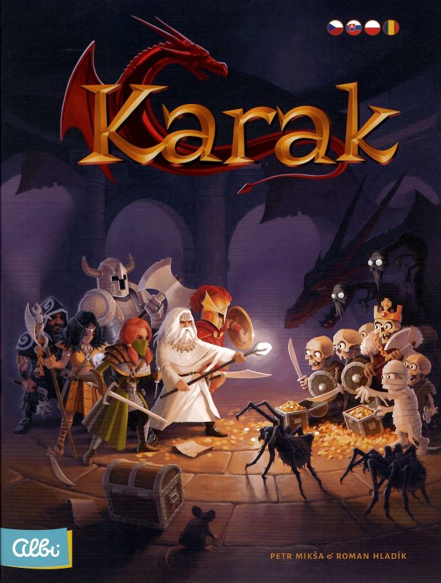 Karak / Petr Miksa, Roman Hladík. - Kraków : Albi, [2019]. - 1 gra (80 kafelek podziemi, 6 pionków bohaterów z podstawkami, 6 kart bohaterów, 5 kart wyposażenia, 25 żetonów punktów wytrzymałości, 43 żetony z potworami, 10 żetonów skrzyń ze skarbami, 2 kości, 1 żeton klątwy, woreczek na żetony potworów i skarbów) : karton, tektura, drewno, plastik, kolor ; w pudełku 32x23x7 cm + instrukcja (45 stron : ilustracje ; 30 cm).