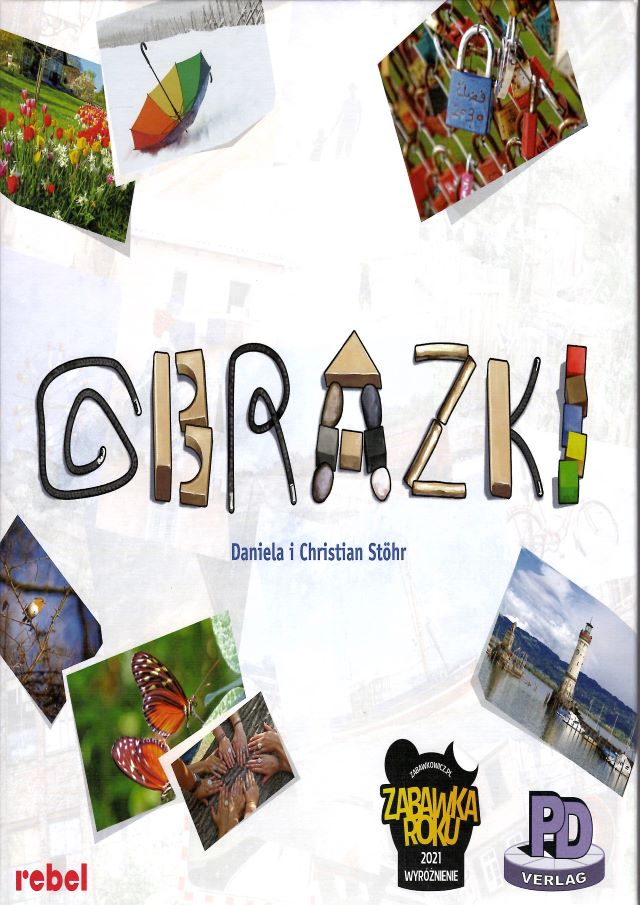 Obrazki / Daniela Stohr, Christian Stohr ; tłumaczenie Kamila Puzdrowska. - Gdańsk : Rebel, [2021]. - 1 gra (91 dwustronnych kart ze zdjęciami, 19 kart z symbolami, 56 żetonów, ramka na obrazek, 4 znaczniki orientacji obrazków, 24 kolorowe kostki, 4 patyki i 4 kamienie, 2 sznurówki, 6 klocków, materiałowy woreczek, notes) : karton, tektura, drewno, kolor ; w pudełku 30x30x7 cm + instrukcja (1 karta : ilustracje ; 28 cm).