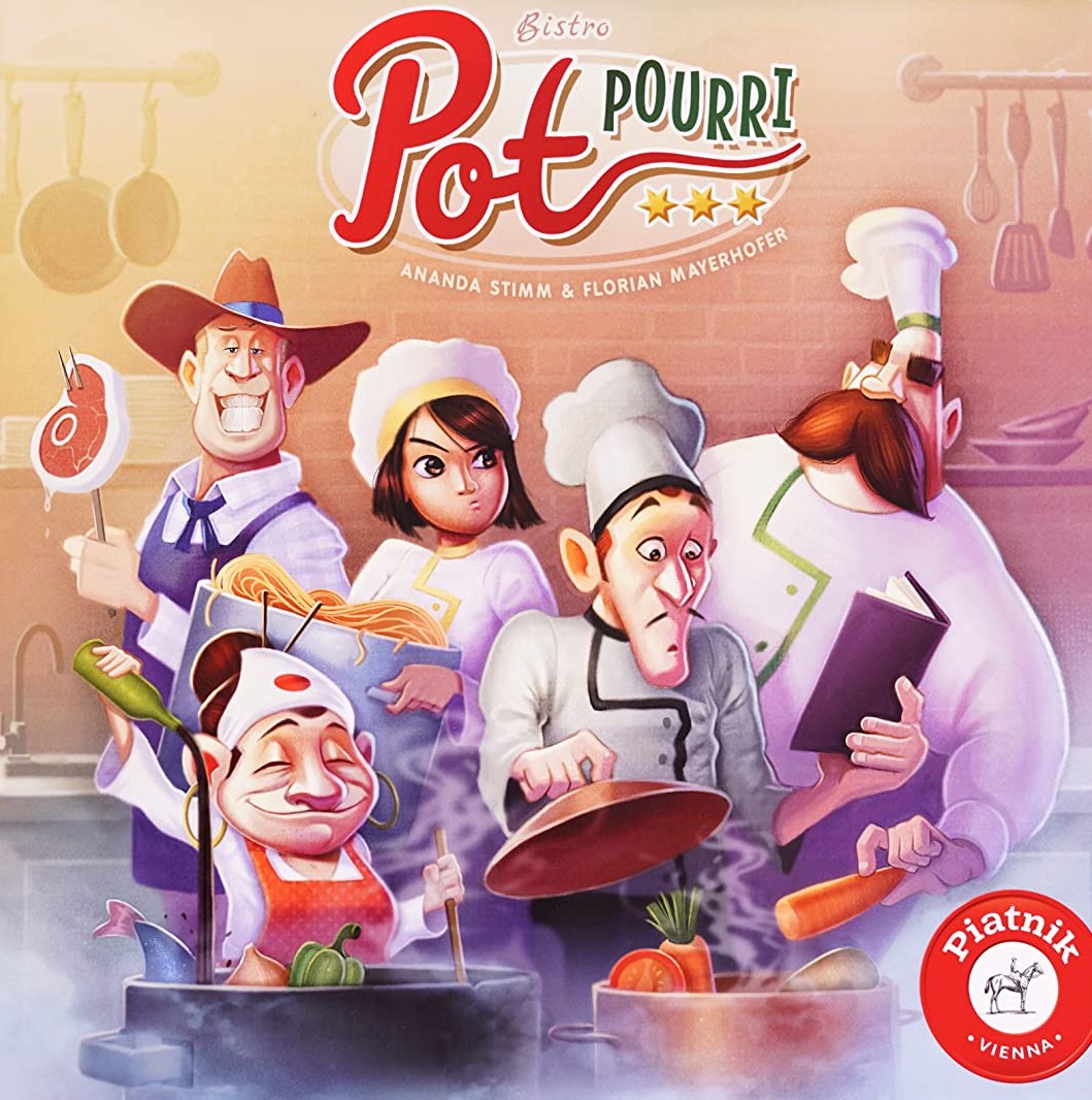 Pot Pourri / Florian Mayerhofer ; ilustracje Felix Wermke. - Wiedeń : Piatnik, 2022. - 1 gra (90 kart składników, 55 kart przepisów, 5 płytek menu, 5 książek kucharskich, 5 pionków w kształcie gwiazdek, 3 garnki, pokrywka, plansza) : karton, plastik, kolor ; w pudełku 26x26x6 cm + instrukcja (36 stron : ilustracje ; 24 cm).