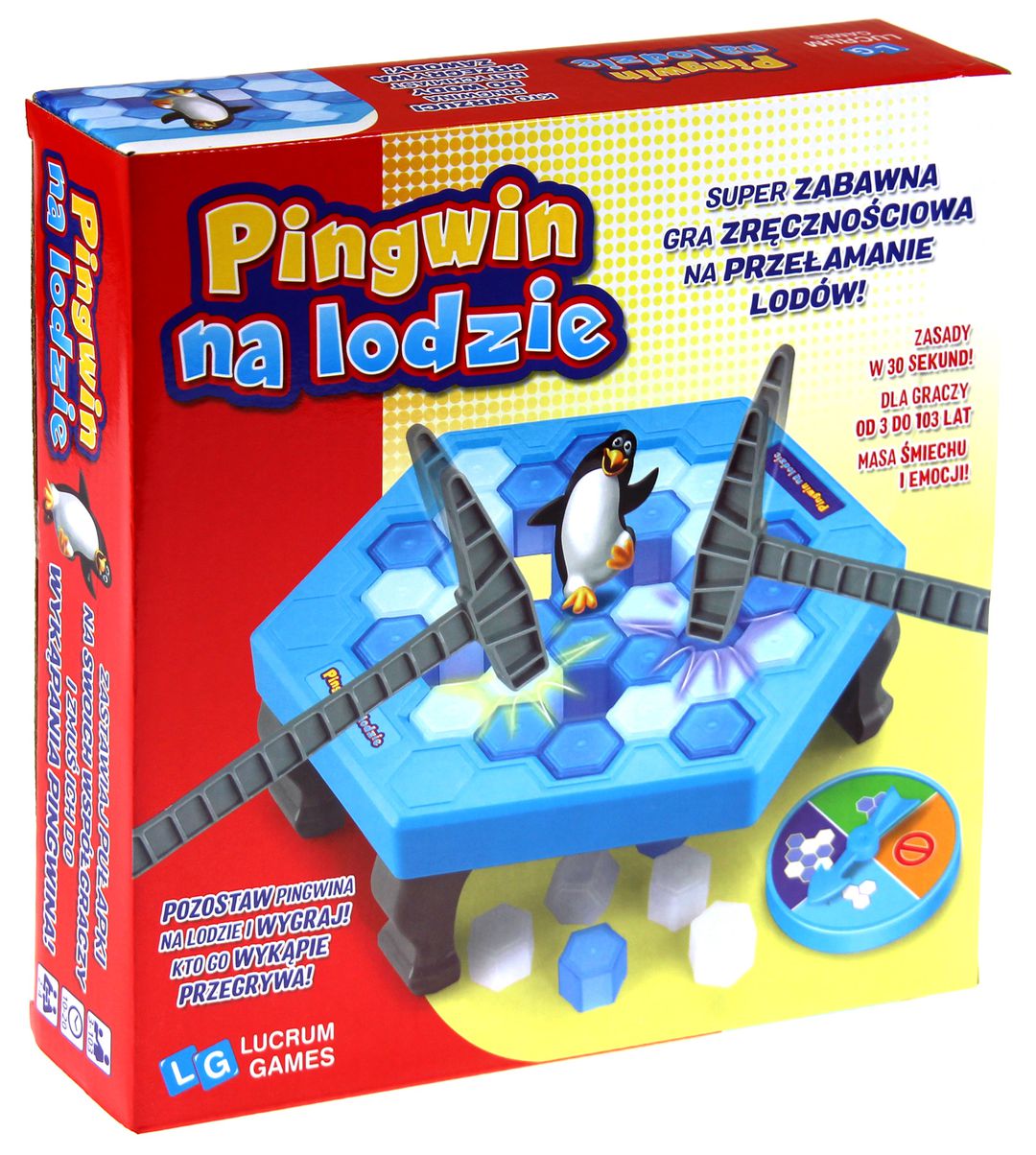 Pingwin na lodzie. - Bielsko-Biała : Lucrum Games, [2024]. - 1 gra (2 młotki, 1 pingwin plastikowy, 4 nóżki, 1 ramka, tarcza losująca, 19 białych kostek lodu, 19 niebieskich kostek lodu) : karton, plastik, tektura, kolor ; w pudełku 6x26x26 cm + instrukcja (na opakowaniu).