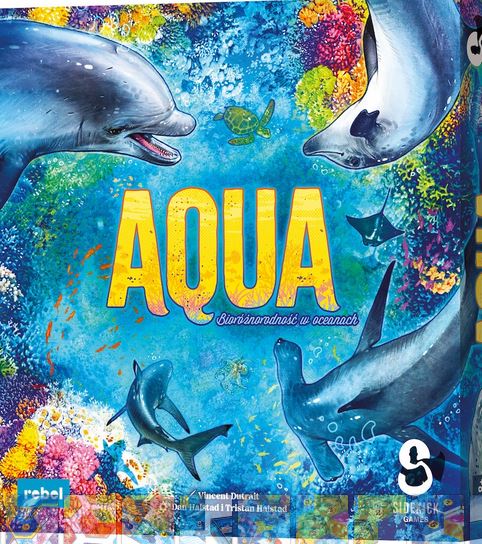 Aqua / Dan Halstad, Tristan Halstad ; ilustracje Vincent Dutrait ; tłumaczenie Katarzyna Koszorek. - Gdańsk : Rebel Sp. z o.o., 2024. - 1 gra (70 płytek koralowców, 72 płytki małych zwierząt, 15 płytek dużych zwierząt, 24 płytki ekosystemów, płytka ślimaka morskiego, 4 płytki obszarów startowych, notes punktacji) : karton, tektura, kolor ; w pudełku 26x26x7 cm + instrukcja (12 stron : ilustracje ; 25 cm).