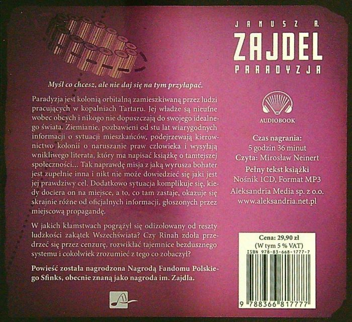 Paradyzja / Janusz A. Zajdel ; czyta Mirosław Neinert. - Katowice : Aleksandria Media Sp. z o.o., 2022. - 1 płyta CD (5 godz. 36 min) : zapis cyfrowy, stereo. ; 12 cm.