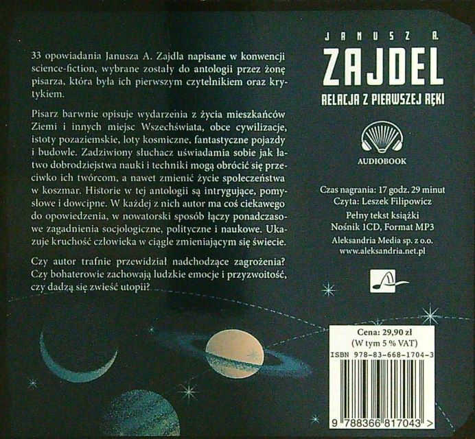 Relacja z pierwszej ręki / Janusz A. Zajdel ; czyta Leszek Filipowicz. - Katowice : Aleksandria Media Sp. z o.o., 2021. - 1 płyta CD (17 godz. 29 min) : zapis cyfrowy, stereo. ; 12 cm.