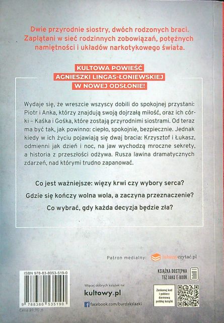 Dlatego, że powieść ta porywa wraz z pierwszym zdaniem. Bo sprawia, że czas mija nieubłaganie szybko. Akcja powieści dzieli się na dwie części, a mianowicie: część pierwsza trzynaście lat wcześniej i część druga trzynaście lat później. (...) Z początku poznajemy młodziutkich bohaterów i ich dotychczasowe życie. Mają po osiemnaście lat i maturę przed sobą. Krzysiek Borowski to szkolny przystojniak, jest w związku z Małgosią Filipiak. Wszystko toczy się swoim torem dopóki w ich życiu nie pojawia się Katarzyna Matczak. Jej ojciec wziął za żonę matkę Małgorzaty, tym samym dziewczyna stała się przyrodnią siostrą młodej Filipiakówny. Życie Katarzyny, Krzyśka, Małgorzaty i Łukasza (starszego brata Krzyśka) zostanie odmienione już na zawsze. Opowieść pokazuje jak poczucie winy i odrzucenia potrafi zniszczyć życie do jego ostatniej sekundy. W tej powieści zostaje udowodnione, że młodzieńcza miłość, która wydaje się być jedyną jaka może nas spotkać, rzeczywiście taka jest. Kiedy wszyscy spotykają się po latach wszystko jest inne, ale uczucia pozostały. Zachowały się również dawne urazy, niewypowiedziane słowa, niewyjaśnione sytuacje i strach, lęk o lepsze jutro, które, jak dowiedzą się bohaterowie nie zawsze jest takie, jakie sobie wymarzyliśmy. Autorka wprowadziła tutaj wątek mafii i czarnego rynku. Osobiście uwielbiam takie klimaty, dlatego też książka ta trafiła na listę moich ulubionych książek. Dodatkowo wątek adwokata i oskarżyciela! Mistrzostwo. Ale o tym musicie sami się przekonać, bo musiałabym wyjawić całą fabułę, a nie o to tutaj chodzi. Tytuł idealnie pasuje do wnętrza książki. Zakręty losu, które spotykają bohaterów niestety, ale są bardzo realistyczne. Wydaje mi się, że kiedy człowiek rzeczywiście trafia na nieodpowiednich ludzi, wszystko może potoczyć się dokładnie takim samym torem jakim toczyło się życie Krzyśka, Kaśki i Łukasza oraz Małgosi. Każdy bohater ma tutaj swoją własną rolę do odegrania a jednocześnie wszystko idealnie łączy się w całość. Bardzo podoba mi się ten zabieg, urozmaica akcję i daje czytelnikowi możliwość dokładnego poznania danej postaci.