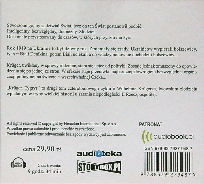 Kruger. T.2, Tygrys /Marcin Ciszewski ; czyta Jarosław Łukomski. - Piaseczno : Heraclon International - Storybox.pl, [2017]. - 1 płyta CD (9 godz. 34 min) : zapis cyfrowy, stereo. ; 12 cm.