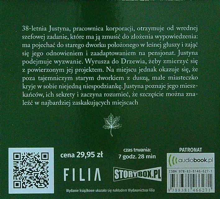 Pensjonat Leśna Ostoja / Joanna Tekieli ; czyta Joanna Domańska. - Poznań : Wydawnictwo Filia Sp. z o.o. ; Piaseczno : Heraclon International - Storybox.pl, 2018. - 1 płyta audio CD (7 godz. 28 min) : digital, stereo ; 12 cm.