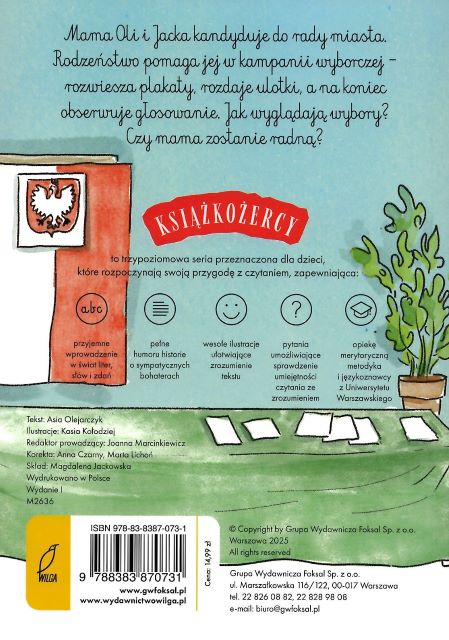 Wybory / Asia Olejarczyk ; ilustracje Kasia Kołodziej. - Wydanie I. - Warszawa : Wydawnictwo Wilga - Grupa Wydawnicza Foksal Sp. z o.o., 2025. - 19, [4] strony, [1] karta tablic : ilustracje ; 21 cm.