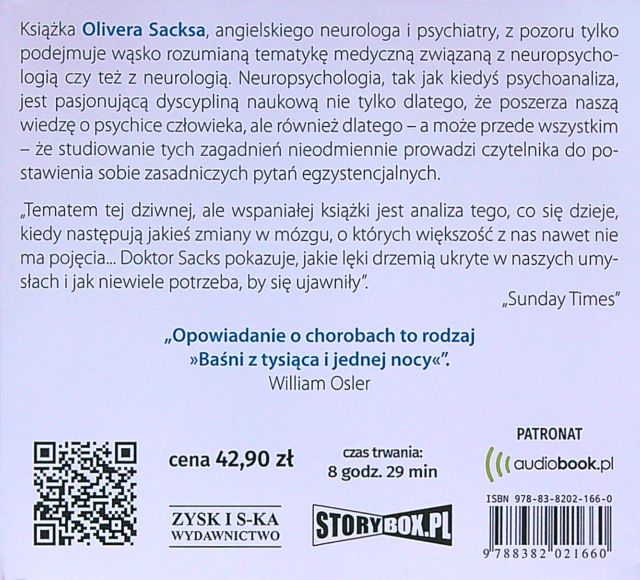 Okazuje się, że umysł ludzki potrafi płatać różne figle i, że tego typu pomyłka jest całkiem możliwa. Publikacja Sacka to książka o istocie człowieczeństwa, w której autor przedstawił analizy osób chorych w kontekście psychicznym. W wielu zaprezentowanych przez niego przypadkach ludzie dotknięci pewnymi neurologicznymi schorzeniami nie zdawali sobie z tego do końca sprawy. Żyli i nauczyli się funkcjonować w społeczeństwie nawet ze swymi "defektami", (...) nie dostrzegając absolutnie żadnego z tym problemu. W tej pasjonującej i zarazem ważnej książce zagłębiamy się w najbardziej skrywane meandry ludzkiej psychiki. Okazuje się, że nasz mózg skrywa ogromnie wiele tajemnic, których do końca istnienia świata pewnie nawet najwybitniejszym neurologom oraz neuropsychologom nie uda się ich do końca zbadać. Jest on jedną z tych części naszego ciała, która zawsze będzie nas zaskakiwać. Przedstawione przez Sacksa przykłady defektów mózgu są zadziwiające, szokujące, wręcz nieprawdopodobne. Choć Sacks jest naukowcem, to to co zostało przez niego opisane na kartach tej książki nie jest dla zwykłego odbiorcy tego tekstu niezrozumiałe. Wszystko zostało wyraźnie przedstawione w sposób głęboki, ale jednocześnie bardzo prosty i w dużej mierze literacki. Uważam, że neuropsychologia to pasjonująca dyscyplina naukowa, pozwalająca na lepsze poznanie naszego mechanizmu myślowego.