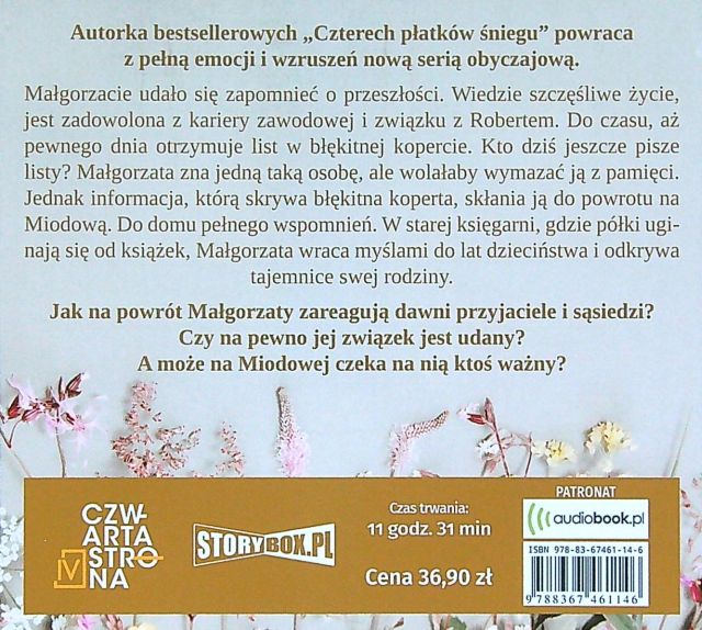 Poranki na Miodowej / Joanna Szarańska ; czyta Paulina Raczyło. - Poznań : Czwarta Strona - Grupa Wydawnictwa Poznańskiego sp. z o.o. ; Piaseczno : Heraclon International - Storybox.pl, 2022. - 1 płyta audio (CD) (11 godz. 31 min) : zapis cyfrowy, stereo. ; 12 cm.