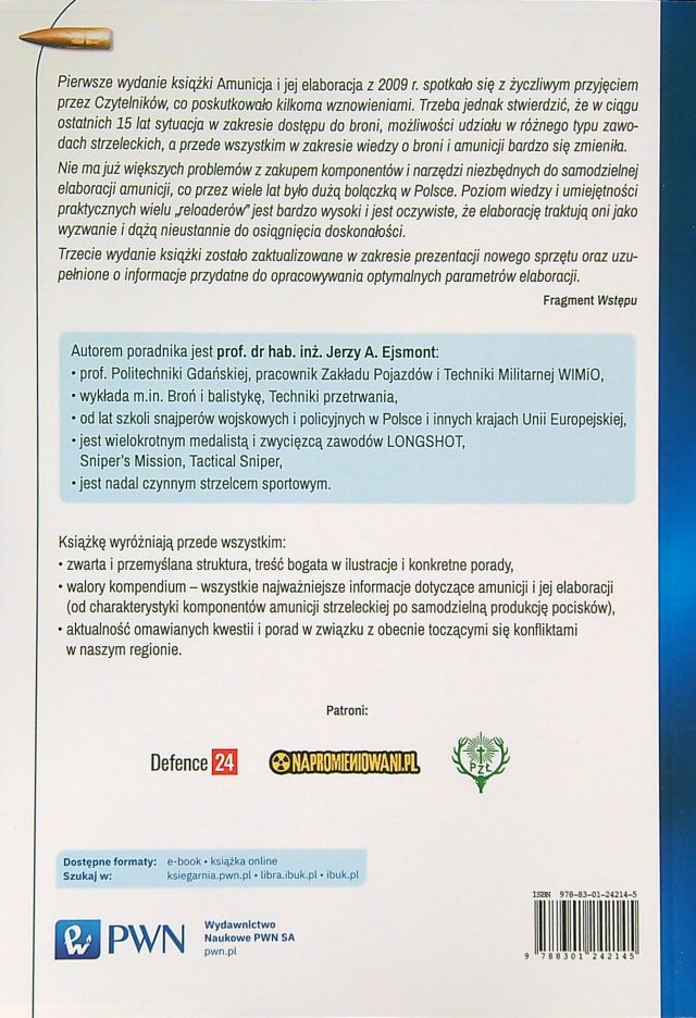 Amunicja i jej elaboracja : praktyczny poradnik / Jerzy A. Ejsmont. - Wydanie 3. uaktualnione i rozszerzone - Warszawa : Wydawnictwo Naukowe PWN SA, 2025. - 249, [2] strony : fotografie, ilustracje, wykresy ; 24 cm.