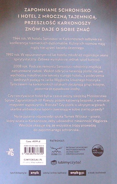 Po raz kolejny, zakochany w Karkonoszach, ale również i czujący przed nimi ogromny respekt i szacunek, pisarz Tomasz Wilczur, zostaje uwikłany w tajemnicze, prywatne śledztwo, które rozpoczną odnalezione po latach a zamurowane w byłym hotelu Sanssouci, (...) zwłoki niemieckiego obywatela, który jako pisarz po latach powraca do Karpacza z promocją swojej książki i pozostaje w nim już niestety jak się okazuje na zawsze… Ciekawym jest fakt, że w osobie niemieckiego pisarza, zostaje ujawniony niemiecki dyplomata, który na przełomie 3-4/04/1944 r brał udział w zorganizowanej pod auspicjami niemieckiego Ministerstwa Spraw Zagranicznej, konferencji dotyczącej „uregulowania kwestii żydowskiej”, która jak dzisiaj już wiemy z historii, w tamtym czasie stanowiła dla nazistowskich Niemiec najwyższy z priorytetów.