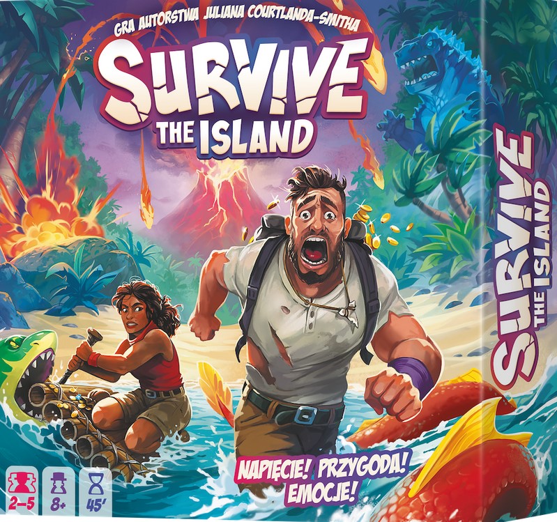 Survive the island / Juliana Courtlanda-Smitha ; ilustracje Mr. Cuddington ; tłumaczenie Sandra Hoffman. - Gdańsk : Rebel, 2024. - 1 gra (plansza, 40 płytek wyspy, 75 drewnianych pionków: 50 poszukiwaczy skarbów, 13 stworów, 12 tratw, 5 kart pomocy, kość stworów) : karton, tektura, drewno, plastik, kolor ; w pudełku 26x26x7 cm + instrukcja (7, [1] stron : ilustracje ; 24 cm).