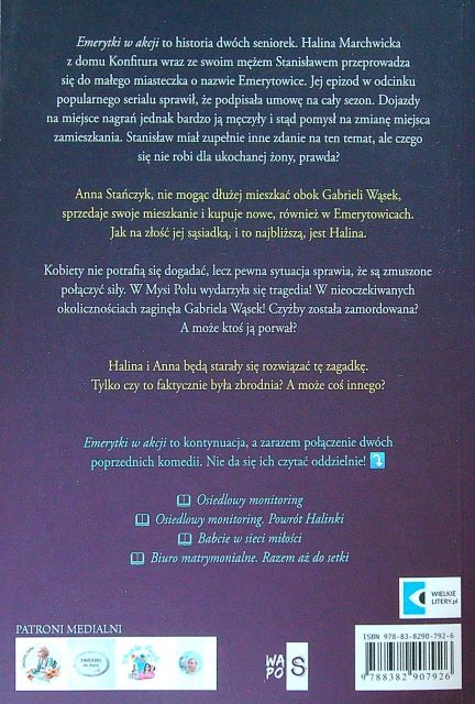 Emerytki w akcji : powieść komediowa / Dagmara Rek. - Wydanie II. - Warszawa : Wydawnictwo WasPos, 2025. - 298, [1] strony ; 24 cm.