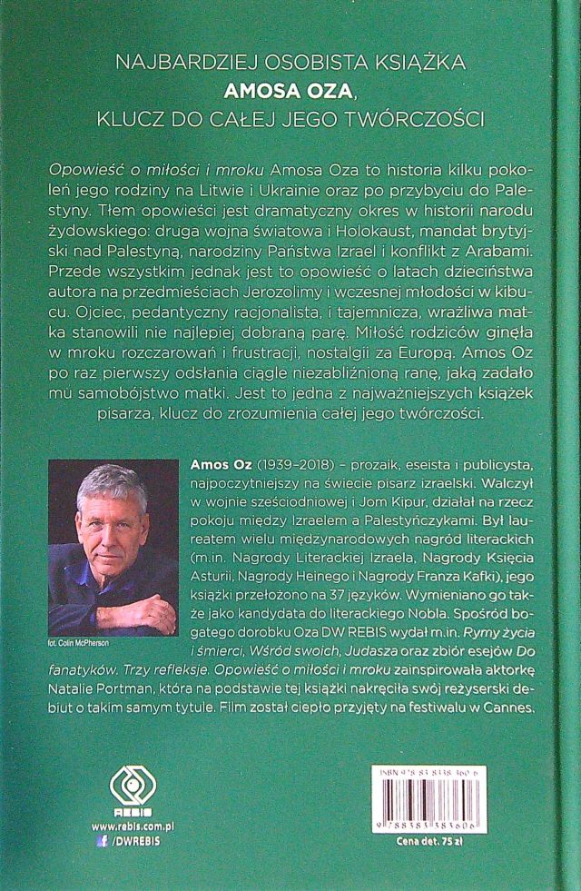 (...)ciasnego i ciemnego. Kończy zaś zapisem ostatnich dni i godzin życia matki. Nie dbając o chronologię Amos Oz tworzy w swej opowieści obraz chłopca zdecydowanie różniącego się od swych kolegów – wrażliwego, oczytanego, żyjącego w swoim świecie. Wystarczają mu książki i samotne zabawy, w których uruchamia wyobraźnię. Nie może być inaczej, jeśli dla jego rodziny książki są czymś najcenniejszym, ważniejszym nawet niż jedzenie. Powieść zawiera wiele pięknych refleksji na temat książek, czytelników, pisarstwa czy natchnienia. Oz czasem włącza fragmenty utworów innych pisarzy lub odwołuje się do własnych. Z „Prostej historii” S. J. Agnona warto zacytować zdanie: „Kiedy świat pogrąża się człowiekowi w mroku, wtedy ten czyta książkę i widzi inny świat”. Ten „inny świat” można znaleźć w barwnych historiach o dziadku Aleksandrze i babci Szlomit Klausnerach, o dziadkach Mussmanach – Icie i Naftalim Hercu pochodzących z Ukrainy i Litwy. Na szczęście obie rodziny zdążyły wyjechać z Europy i uniknęły tragedii Holocaustu. Tylko brat ojca pisarza został z rodziną w Wilnie i wszyscy zginęli w getcie. Tragedia narodu żydowskiego brzmi w tle opowieści Oza, wracają ci, którzy ocaleli, rodzi się państwo izraelskie, wciąż wybuchają konflikty z Arabami. Można z tej książki poznać choć trochę zawiłe losy Żydów, którzy pragnęli stworzyć swe państwo, żyć w nim w pokoju. Część chciała żyć w kibucach, by tam stworzyć wspólnotę, uwierzyć, że nikt już ich nie wypędzi, że są u siebie. Oz opowiada o tym wszystkim pięknym, poetyckim językiem, z metaforami i porównaniami, z niezwykłymi opisami, z mnóstwem szczegółów takich choćby jak ptaszek Eliza śpiewający Beethovenowski trel. To właściwie nie jest zwykła autobiografia, to powieść, którą czyta się jak księgę mądrości o życiu, tym co jest w nim ważne, o wartościach, o „miłości i mroku”.