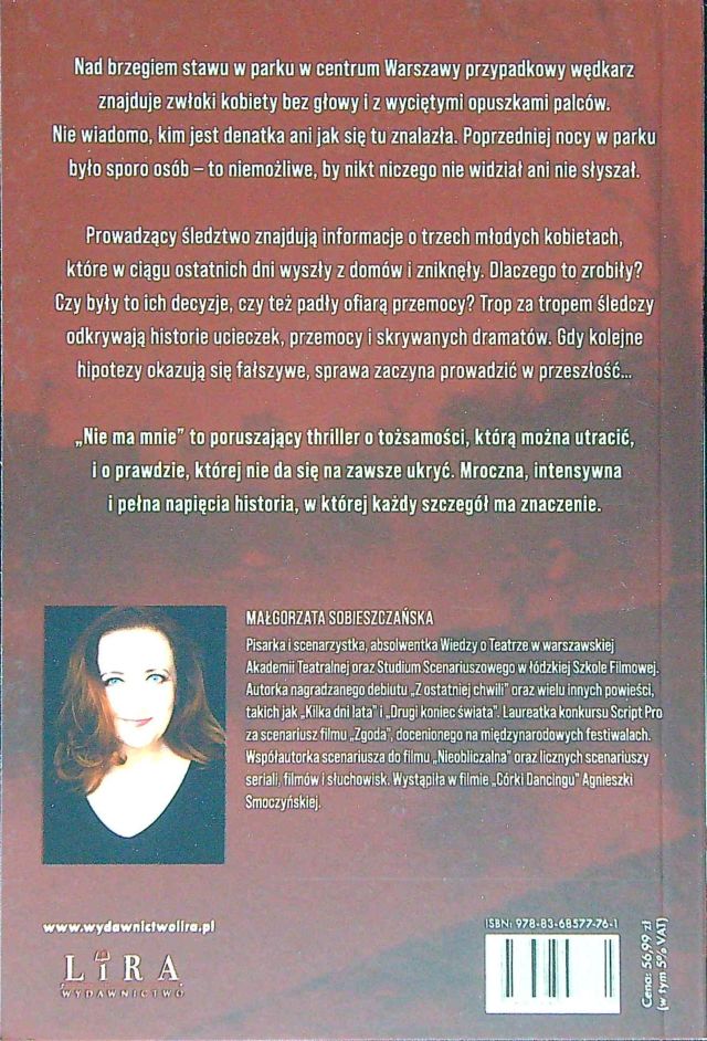 Nie ma mnie / Małgorzata Sobieszczańska. - Warszawa : Lira Publishing Sp. z o.o., 2026. - 394, [1] strona ; 21 cm.