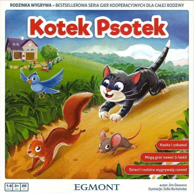 Kotek psotek / Jim Deacove ; ilustracje Zofia Burkowska. - Warszawa : Egmont, 2024. - 1 gra (1 plansza, drzewo składające się z 2 części, 4 figurki (kotek, myszka, wiewiórka, ptaszek), 2 kostki, 2 dyski do zamocowania na drzewie, 4 kafelki z kocimi przysmakami) : drewno, tektura, kolor ; w pudełku 26x26x4 cm + instrukcja (3, [1] strona : ilustracje ; 19 cm).
