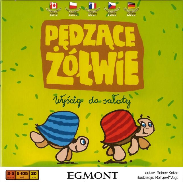 Pędzące żółwie : Wyścig do sałaty / Reiner Knizia ; ilustracje Rolf Vogt. - Warszawa : Egmont Polska, 2022. - 1 gra (plansza, 5 figurek żółwi, 52 karty, 5 płytek z żółwiami) : karton, drewno, tektura ; w pudełku 20x20x5 cm + instrukcja [2] strony : ilustracje ; 19 cm.