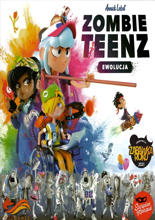 Zombie Teenz : ewolucja / Annick Lobet ; tłumaczenie: Arek Maj. - Warszawa : FoxGames, 2021. - 1 gr (1 plansza miasta, 4 figurki bohaterów, 4 płytki hordy zombie, 4 płytki opanowanych budynków, 4 skrzynki ze składnikami, 1 biała kostka, 1 czarna kostka, 6 kart wydarzeń, 10 kopert ewolucji, 4 koperty osiągnięć, 11 plastikowych podstawek, 1 arkusz naklejek) : plastik, tektura, kolor ; w pudełku 6x19x19 cm + instrukcja (23 strony : ilustracje ; 18 cm).