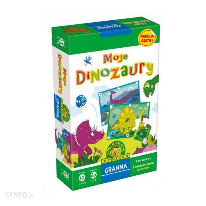 Moje dinozaury : Puzelki / ilustracje Agnieszka Kowalska. - Warszawa : Granna sp. z o.o., 2021. - 1 gra (6 puzelków, każdy z 6 części, 2 tekturowe dinozaury, propozycje zabaw) : karton, tektura, kolor ; w pudełku 19x19x5 cm + instrukcja (4 strony : ilustracje ; 15 cm).