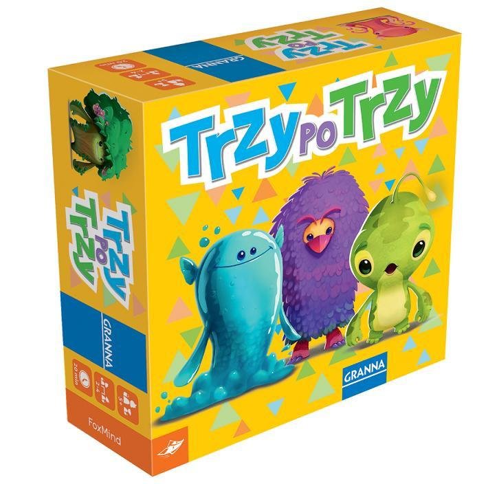 Trzy po trzy. - Warszawa : Granna, 2020. - 1 gra (81 kart stworków, 9 kart startowych, 18 żetonów punktowych) : karton, tektura, kolor ; w pudełku 13x13x5 cm + instrukcja (8 stron : ilustracje ; 12 cm).