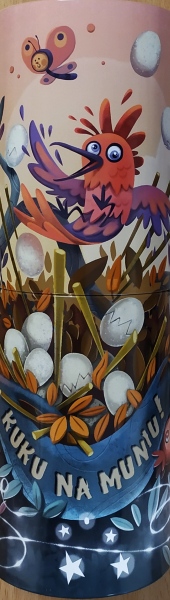 Kuku na muniu / Viktor Bautista i Josep M. Allue ; [ilustrator] Monsuros ; [ tłumaczenie Joanna Wójtowicz]. - Warszawa : Granna, 2024. - 1 gra (podstawa gniazda (dolna część puszki), pionek Kuku, 70 drewnianych patyczków, 20 jajek) : plastik, drewno, kolor ; w pudełku 27x10x10 cm + instrukcja (8 stron : ilustracje ; 20 cm.)