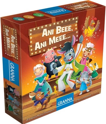 Ani beee ani meee / Federica Minzio Compagnoni ; ilustracje Marcin Południak. - Warszawa: Granna, 2023. - 1 gra (16 kafelków zwierzat, 21 żetonów akcji, dwustronna plansza, 5 żetonów nutek) : karton, kolor, plastik ; w pudełku 19x19x4 cm + instrukcja (8 stron : ilustracje ; 15 cm).