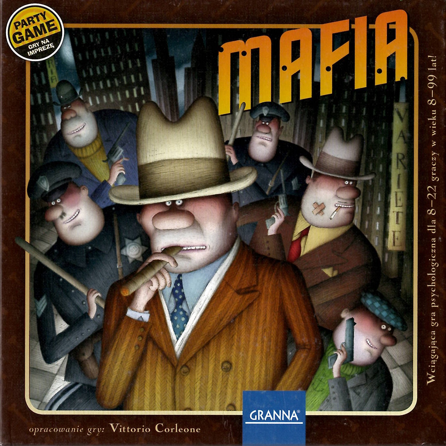 Mafia / opracowanie gry Vittorio Corleone ; projekt graficzne i ilustracje Piotr Socha. - Warszawa : Granna, 2010. - 1 gra (21 żetonów postaci - 1 agent, 15 policjantów, 5 mafiosów, 30 kart gry) : karton,tektura, kolor ; w pudełku 19x19x4 cm + instrukcja (24 strony : ilustracje ; 15 cm).