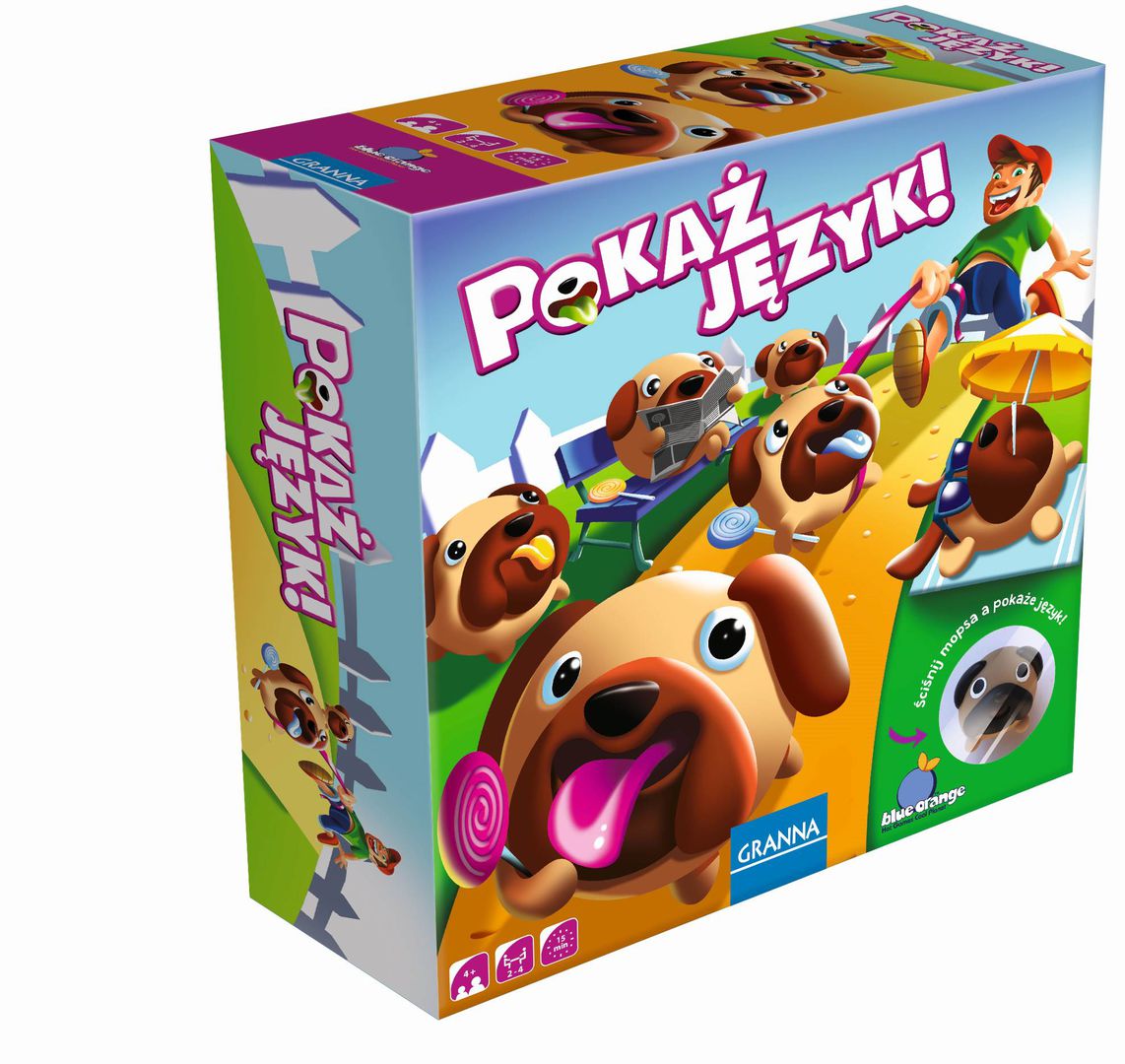 Pokaż język. - Warszawa : Granna, 2022. - 1 gra (12 mopsów, 2 kostki z lizakami, 4 plansze ogrodów) : guma, karton, plastik, kolor ; w pudełku 6x25x25 cm + instrukcja ([2] strony : ilustracje ; 24 cm).