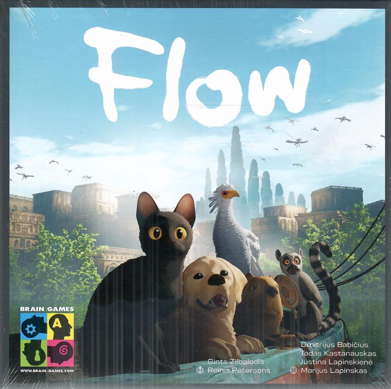 Flow / Dmitrijus Babicius, Tadas Kastanauskas, Justina Lapinskiene, Marijus Lapinskas ; ilustracje Gints Zilbalodis, Reinis Petersons. - Warszawa : Granna 2024. - 1 gra (plansza do gry, 2 kości Gigantycznych Fal (1 czarna, 1 biała), 3 żetony Ptaków, 26 kart (15 kart Akcji, 11 kart Scenariuszy), 51 płytek, 1 płytka Łodzi, 8 płytek przeszkód Scenariusza) : karton, kolor ; 21x21x7 cm + instrukcja (47 strony : ilustracje ; 17 cm).