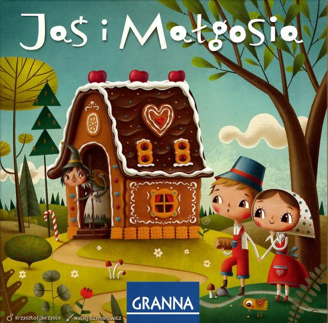 Jaś i Małgosia / Krzysztof Jurzusta ; ilustracje Maciej Szymanowicz. - Warszawa : Granna, 2021. - 1 gra (2 kafelki startowe, 40 kafelków słodkości, 8 żetonów pierniczków, 4 kafelki czapek Baby Jagi, 3 pionki, chatka Baby Jagi) : karton, tektura, drewno, kolor ; w pudełku 19x19x4 cm + instrukcja (11, [1] strona : ilustracje ; 15 cm).