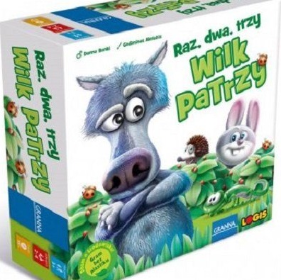 Raz dwa trzy wilk patrzy / Danna Banki ; ilustracje Gediminas Akelaitis. - Warszawa : Granna, 2022. - 1 gra (1 plansza, 12 zwierzatek, 12 tekturowych podstawek, 4 elementy ścieżki, wilk, kostka) : karton, drewno kolor ; w pudełku 8x26x26 cm + instrukcja ([2] strony : ilustracje ; 23 cm).