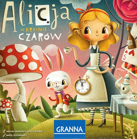 Alicja w Krainie Czarów / Martino Chiacchiera, Remo Conzabori ; ilustracje Maciej Szymanowicz. - Warszawa : Granna, 2023. - 1 gra (plansza ze wskazówką, 24 duże ciasteczka, 20 małe ciasteczka, 44 karty do gry, 4 małe pionki, 4 duże pionki, 8 podstawek, 4 nakładki o dużych pionków) : karton, plastik, tektura, kolor ; w pudełku 19x19x4 cm + instrukcja (16 stron : ilustracje ; 15 cm).