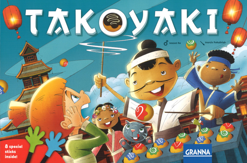 Takoyaki / Mason Ro ; ilustracje Marcin Południak, Aga Maszota, Rafał Szłapa. - Warszawa : Granna, 2024. - 1 gra (40 kart, 8 łapek, 24 żetonów takoyaki, 4 grille) : karton, tektura, kolor ; w pudełku 23x35x6 cm + instrukcja (24 strony : ilustracje ; 21 cm).